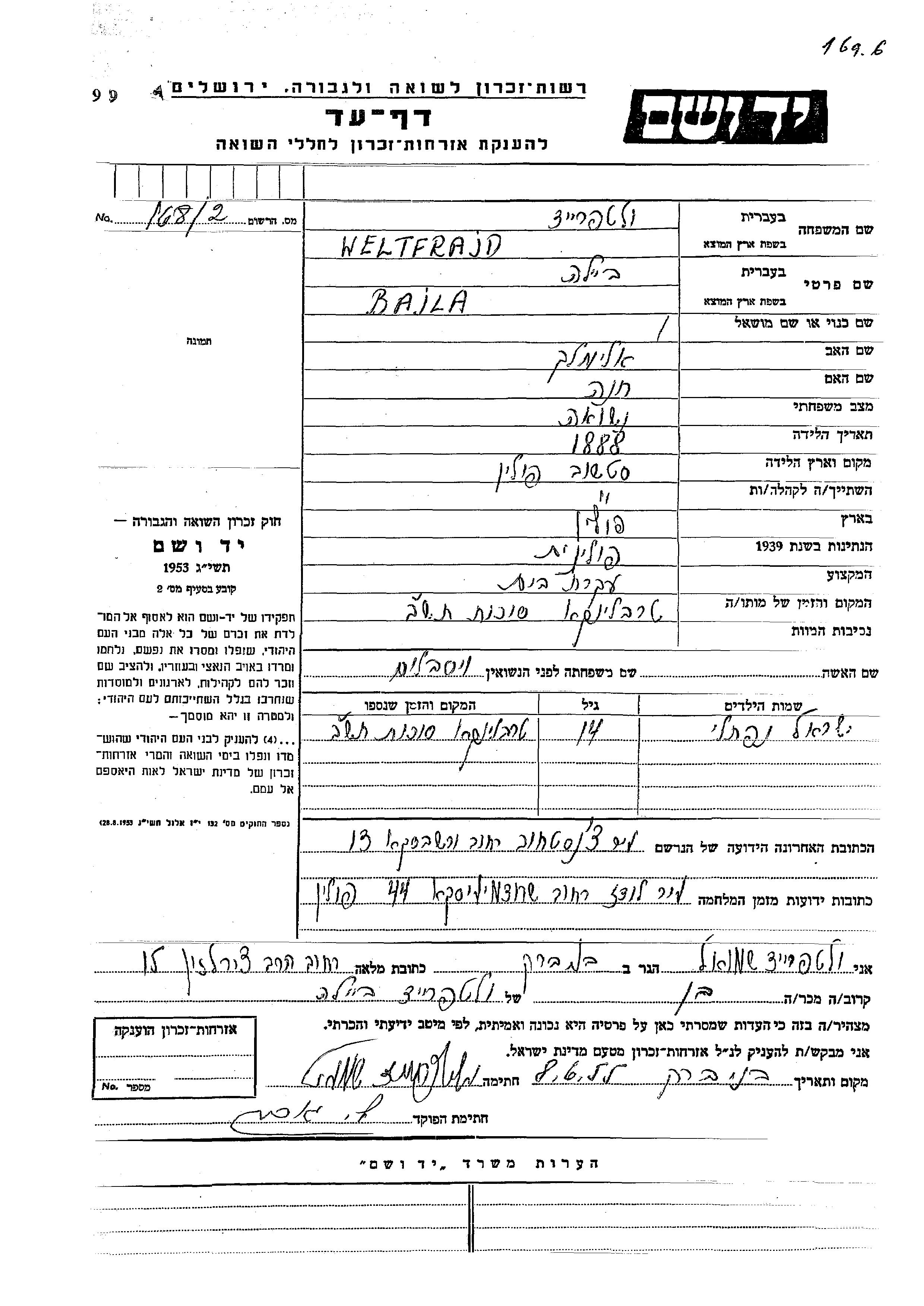 Yisrael Naftali Weltfrajd est né fils de Bajla née Veisblum. Il était Enfant. Avant la seconde guerre mondiale il vivait à Pologne. Au cours de la guerre, il était à Pologne.