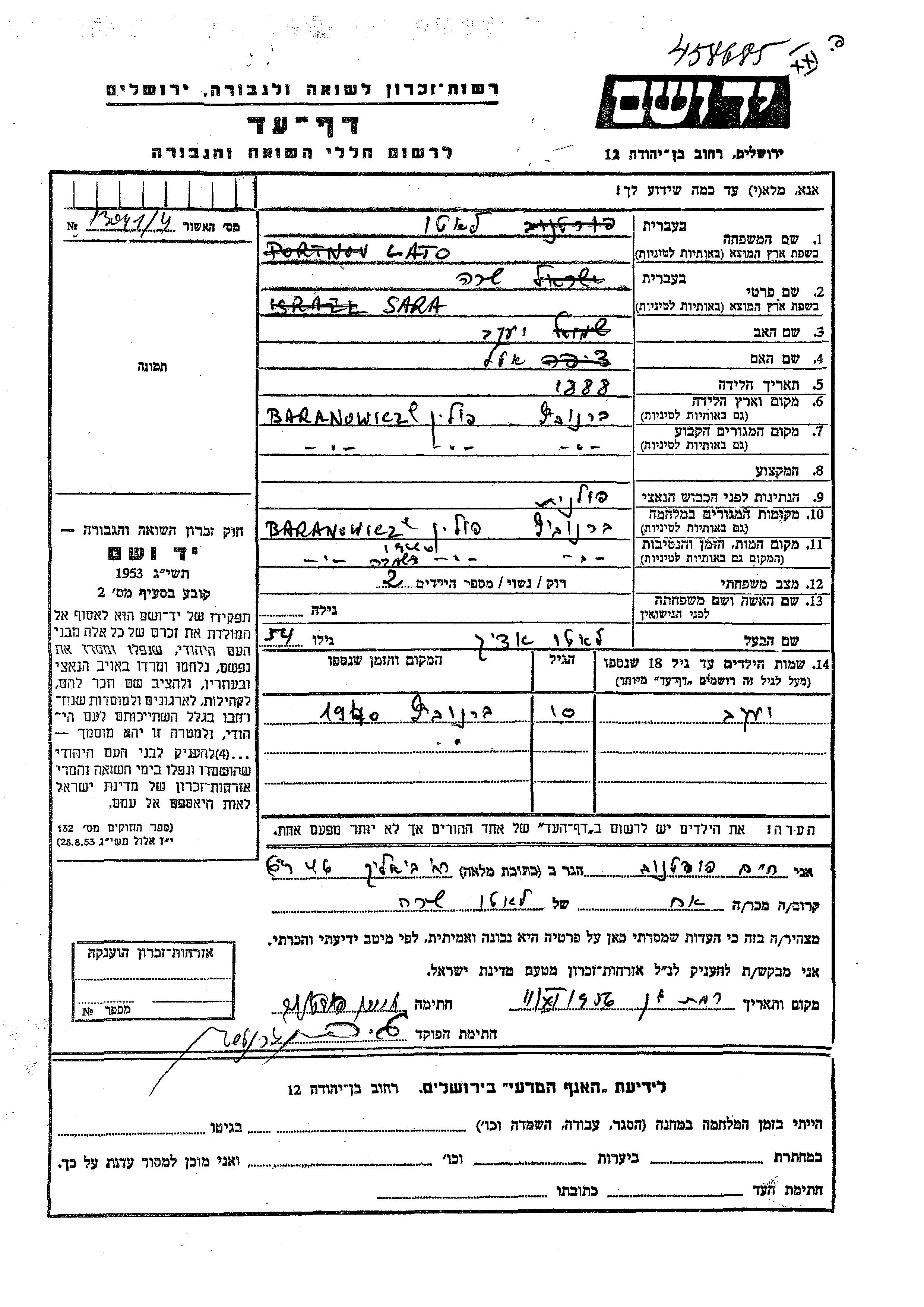 Lato Latte Yaakov Baranowicz, Pologne Feuille de témoignage
