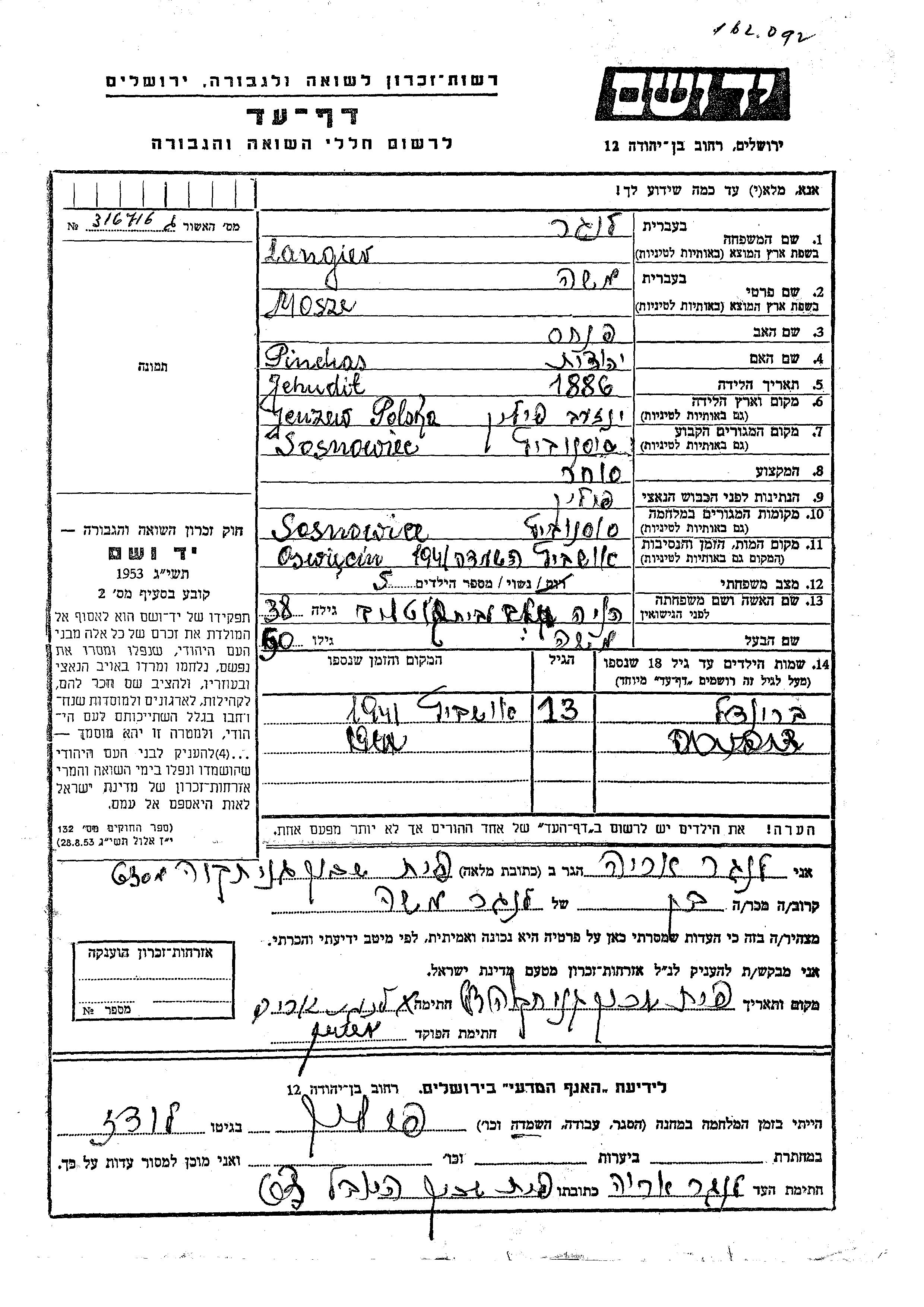 Langier Breina Sosnowiec, Pologne Feuille de témoignage