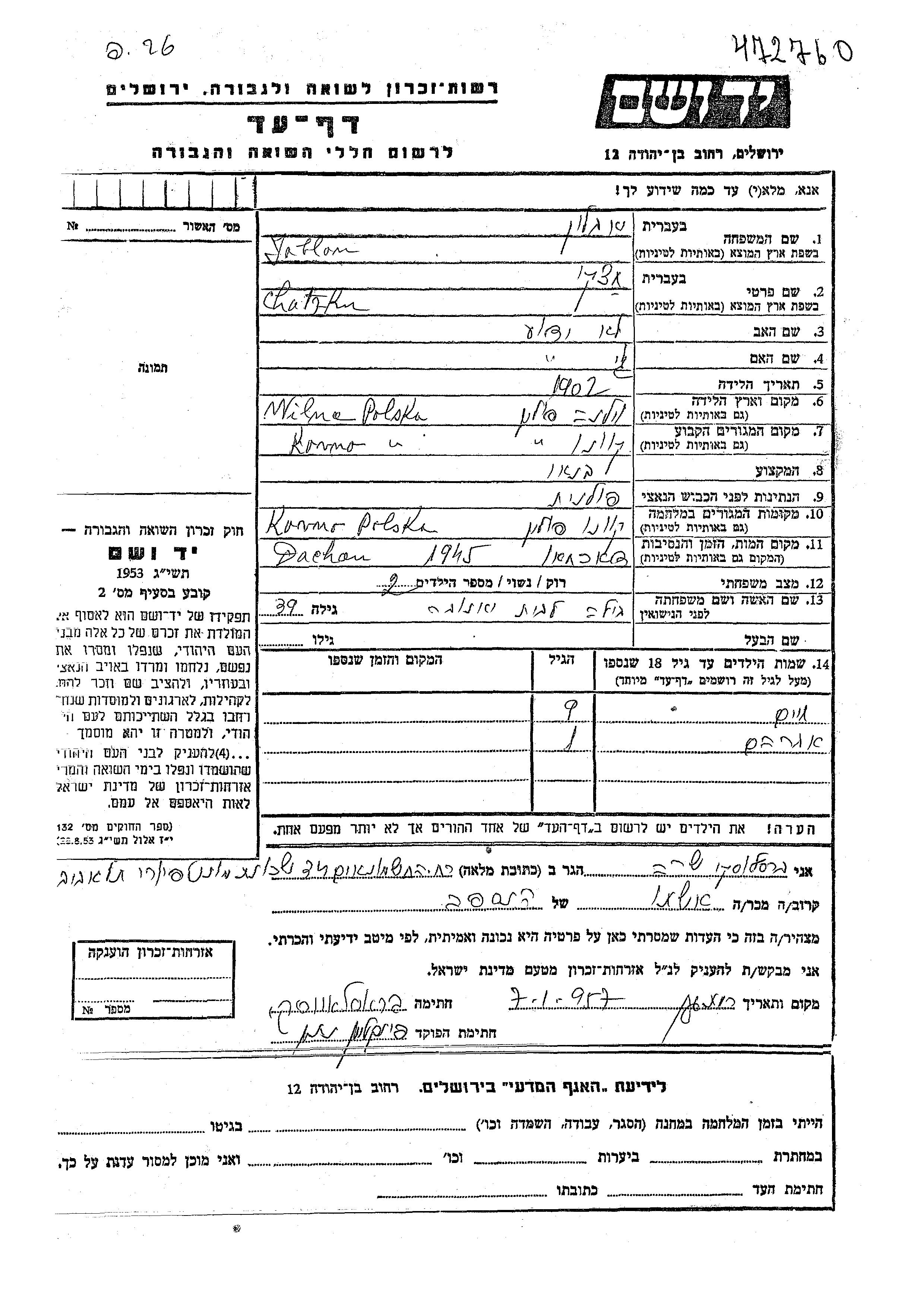 Yad Vashem - Pages of Testimony Names Memorial Collection