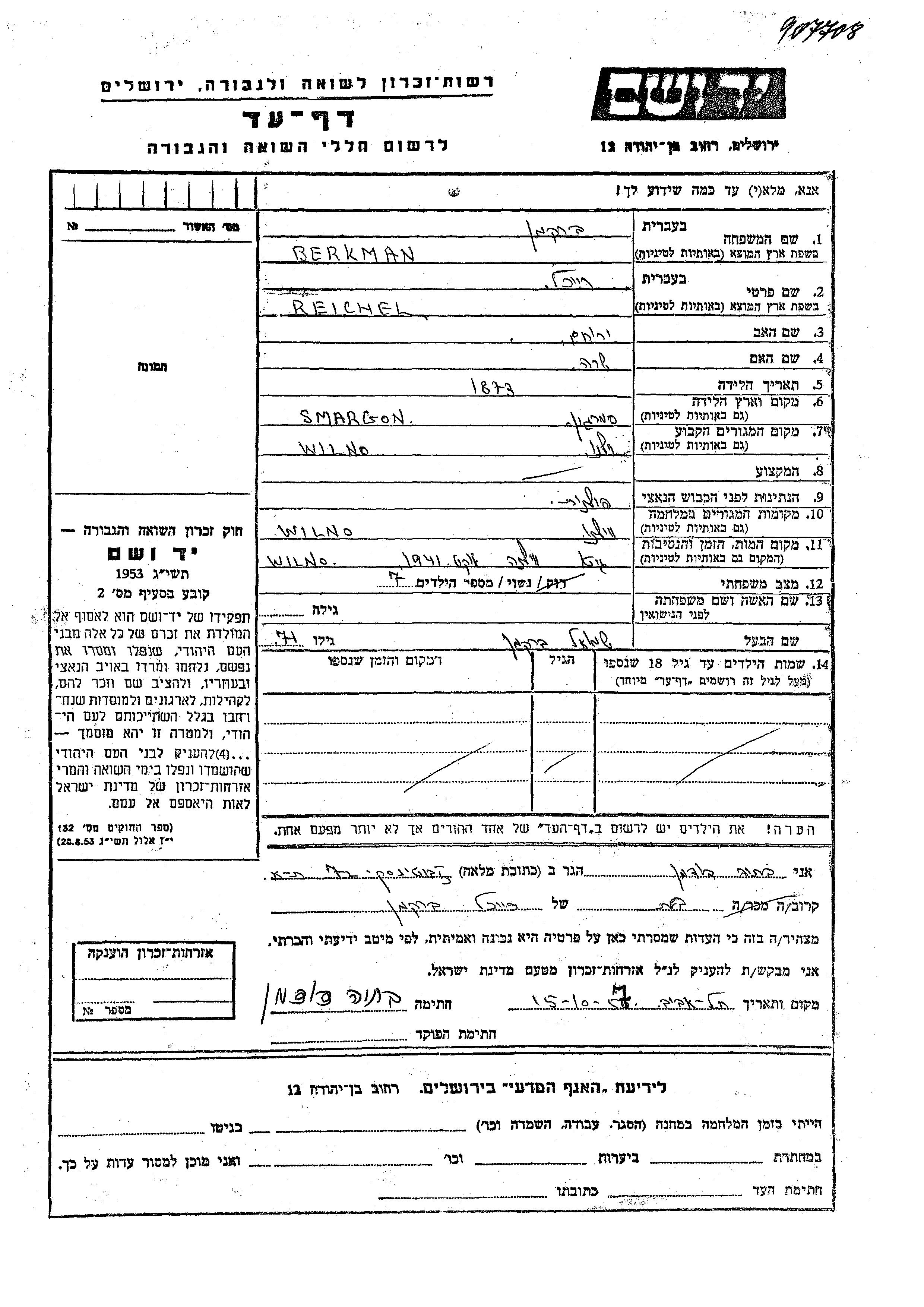 Berkman Reichel 1873 Wilno, Pologne Feuille de témoignage