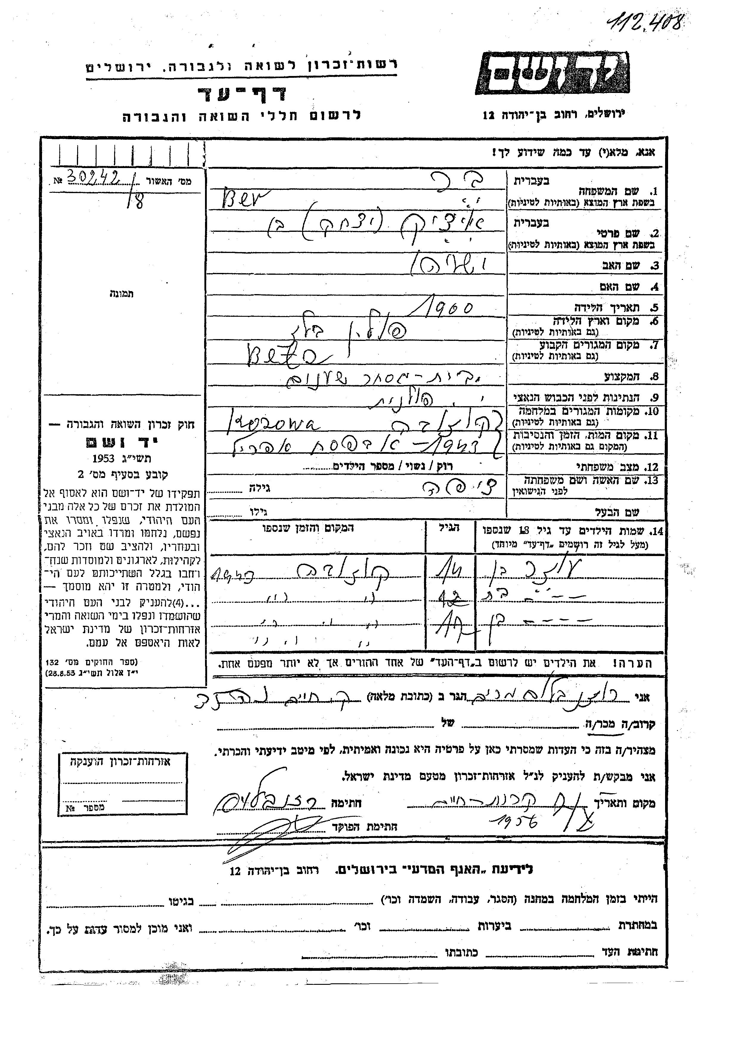 Ber prénom inconnu Belz, Pologne Feuille de témoignage