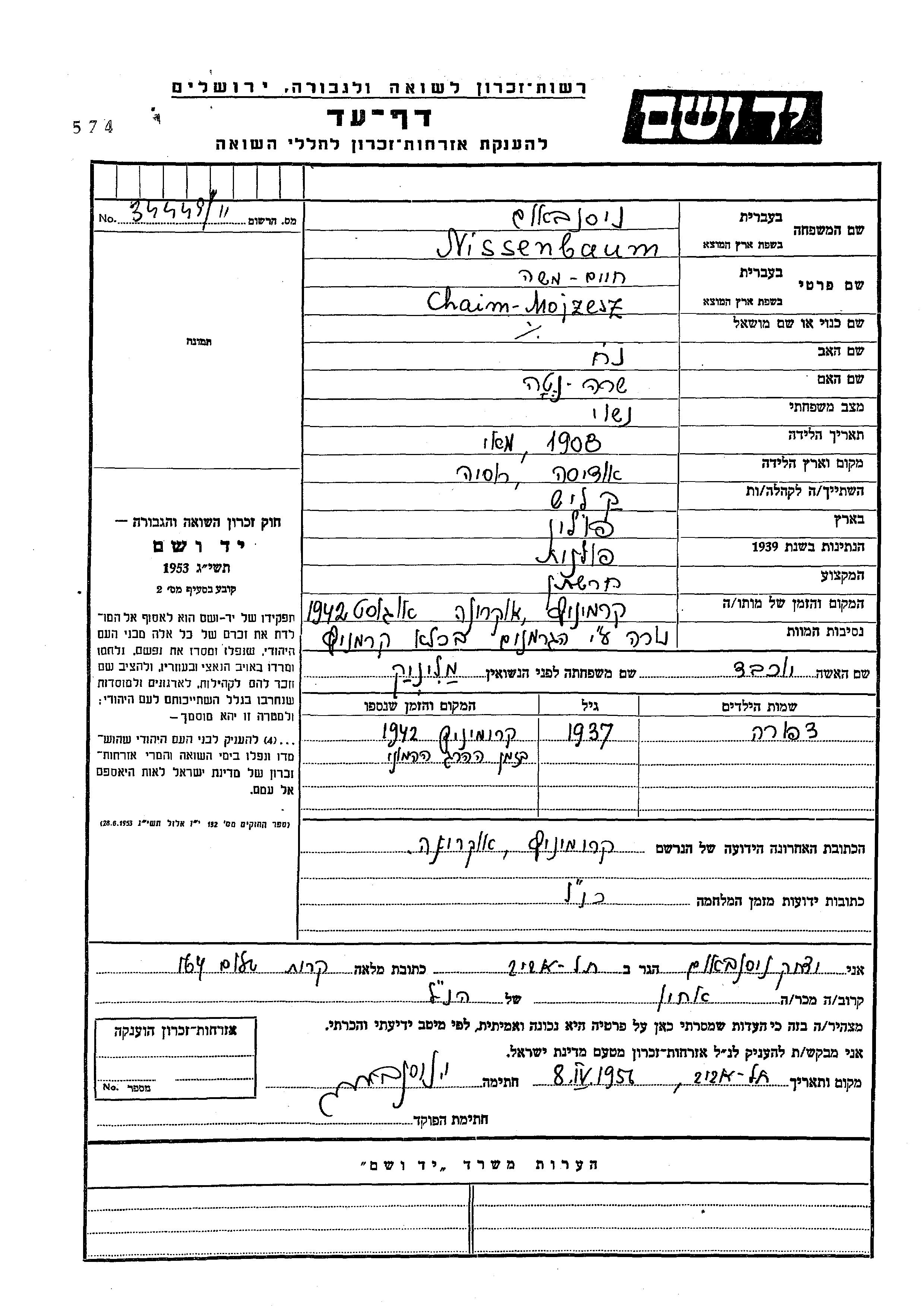 Nissenbaum Tzipora 1937 Krzemieniec, Pologne Feuille de témoignage