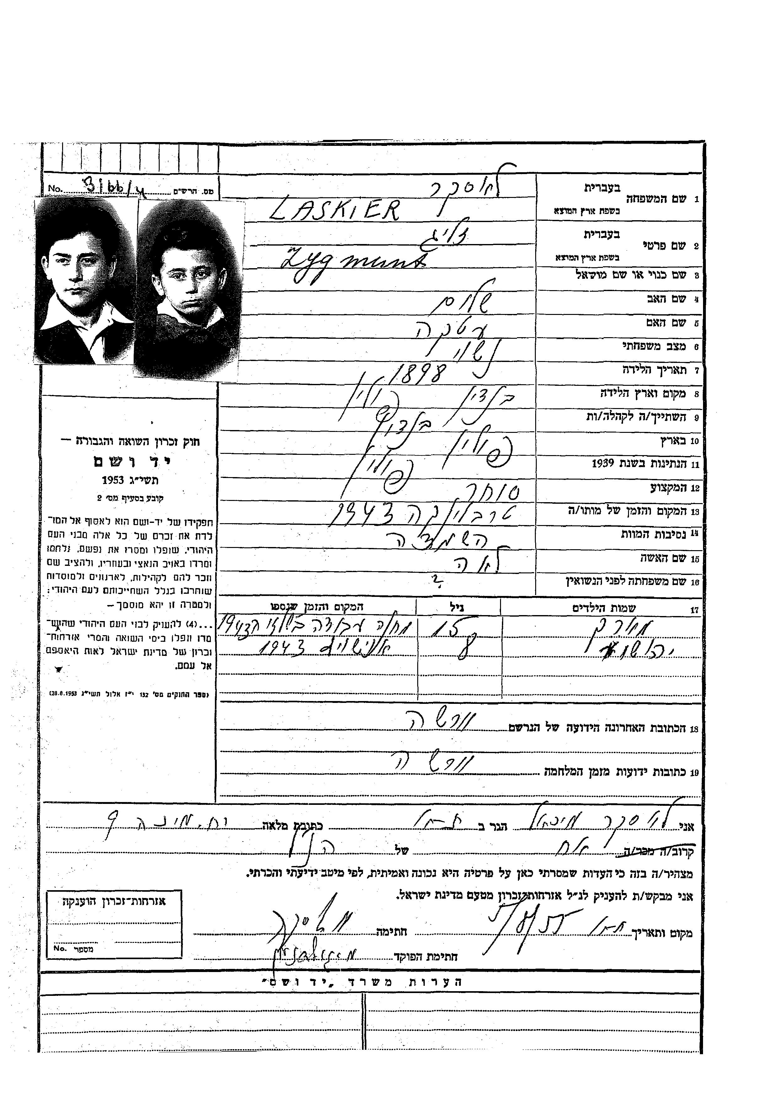 Yehoshua Laskier est né fils de Zygmunt Zelig et de Lea. Il était Enfant. Avant la seconde guerre mondiale il vivait à Będzin, Pologne. Au cours de la guerre, il était à Warschau, Pologne.