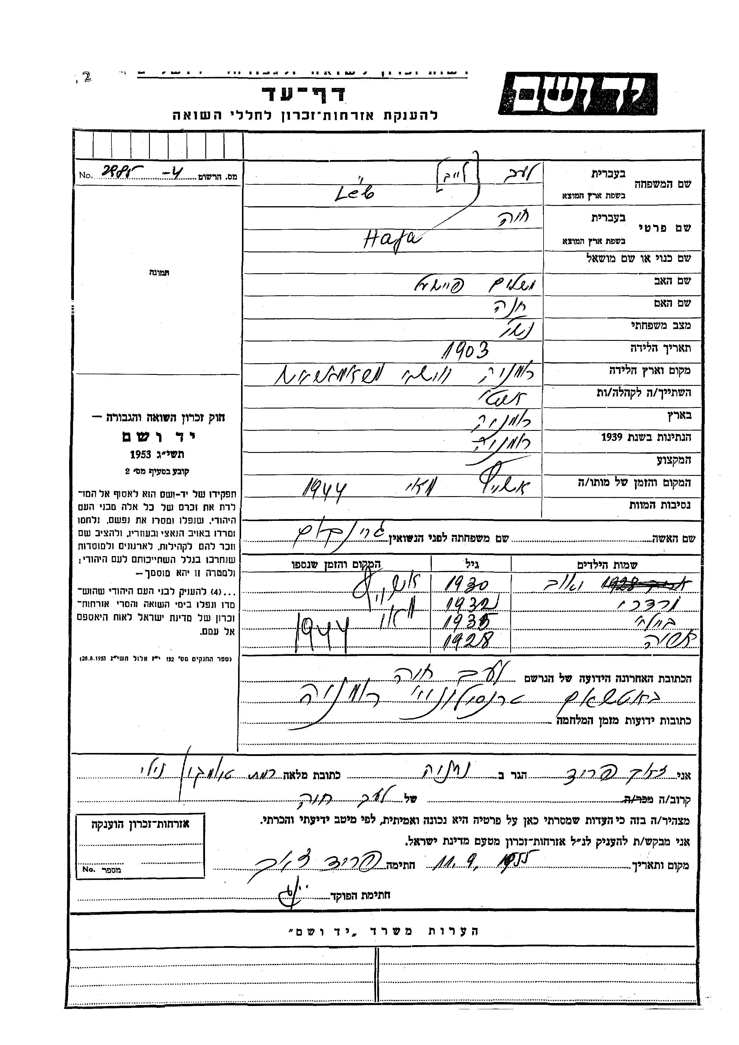 Leb Lev Leib Yoav 1930 Roumanie Feuille de témoignage