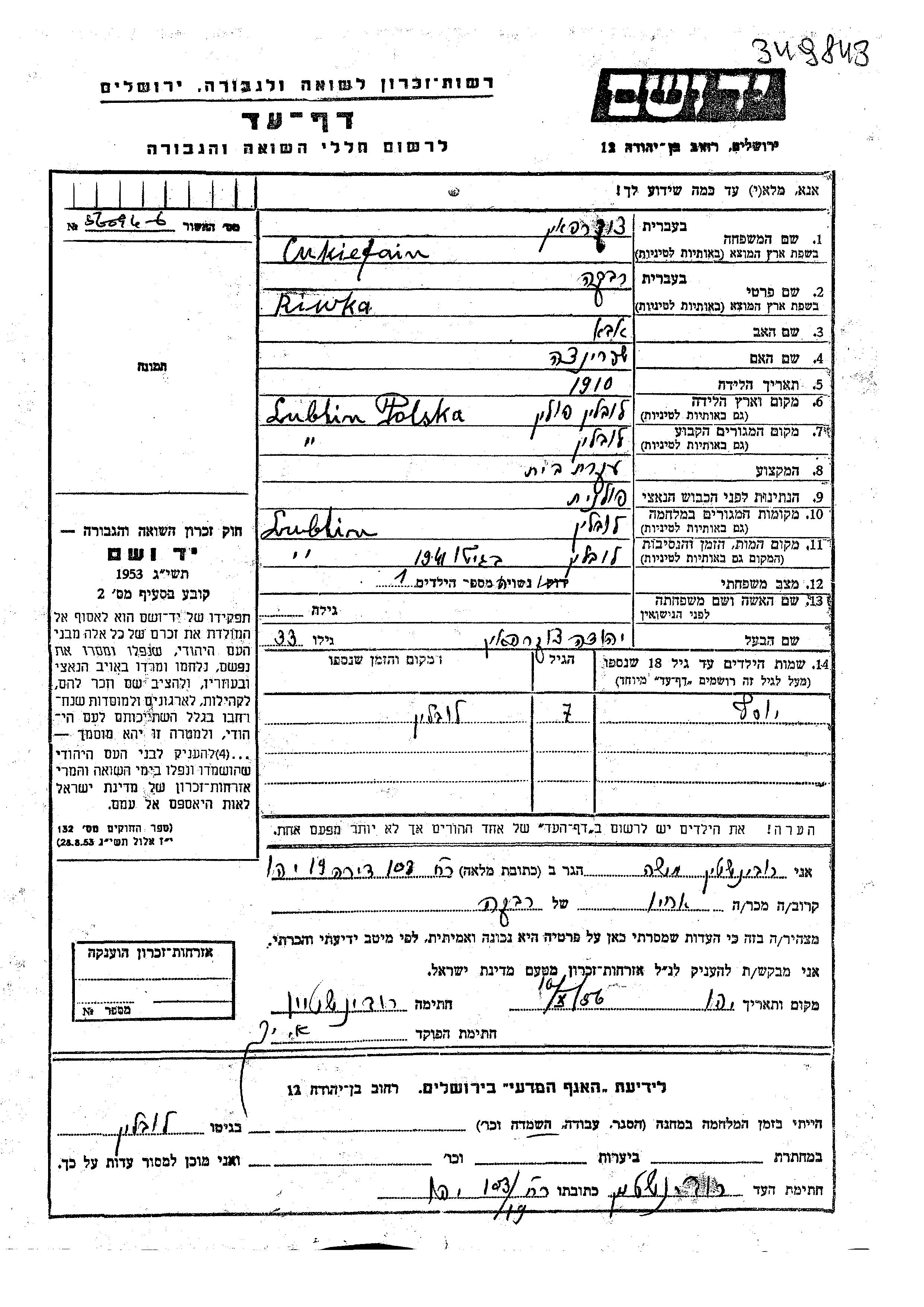Cukierfain Yosef Lublin, Pologne Feuille de témoignage