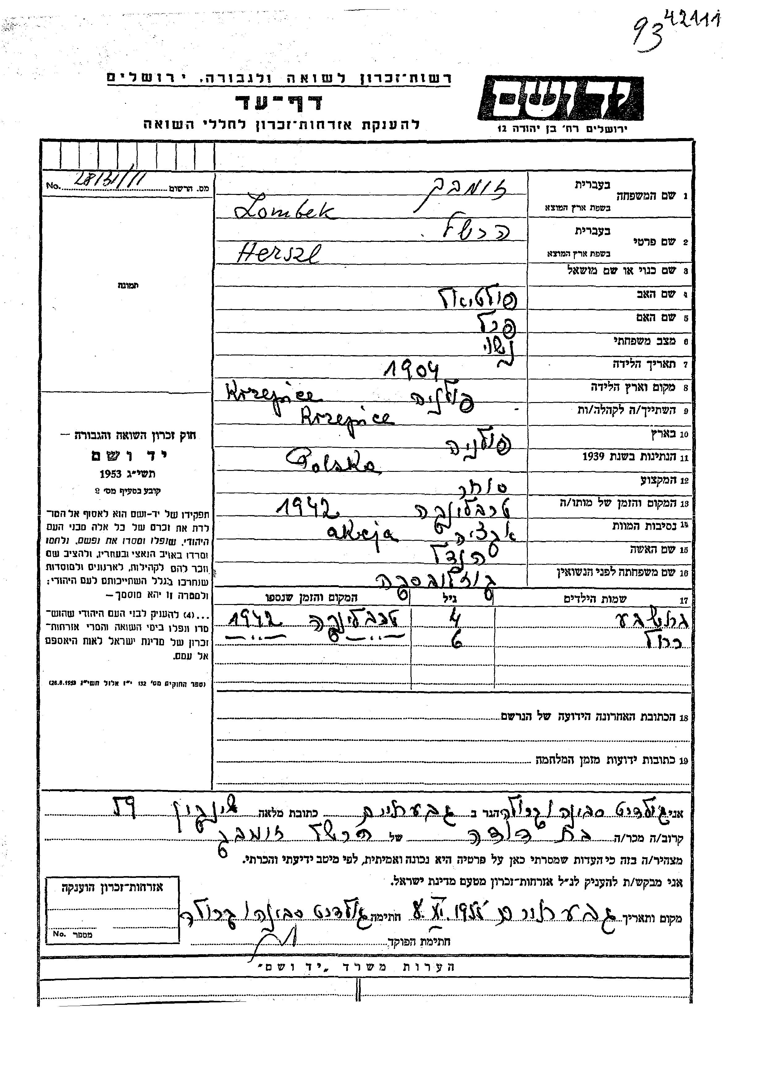 Zombek Batsheva Krzepice, Pologne Feuille de témoignage