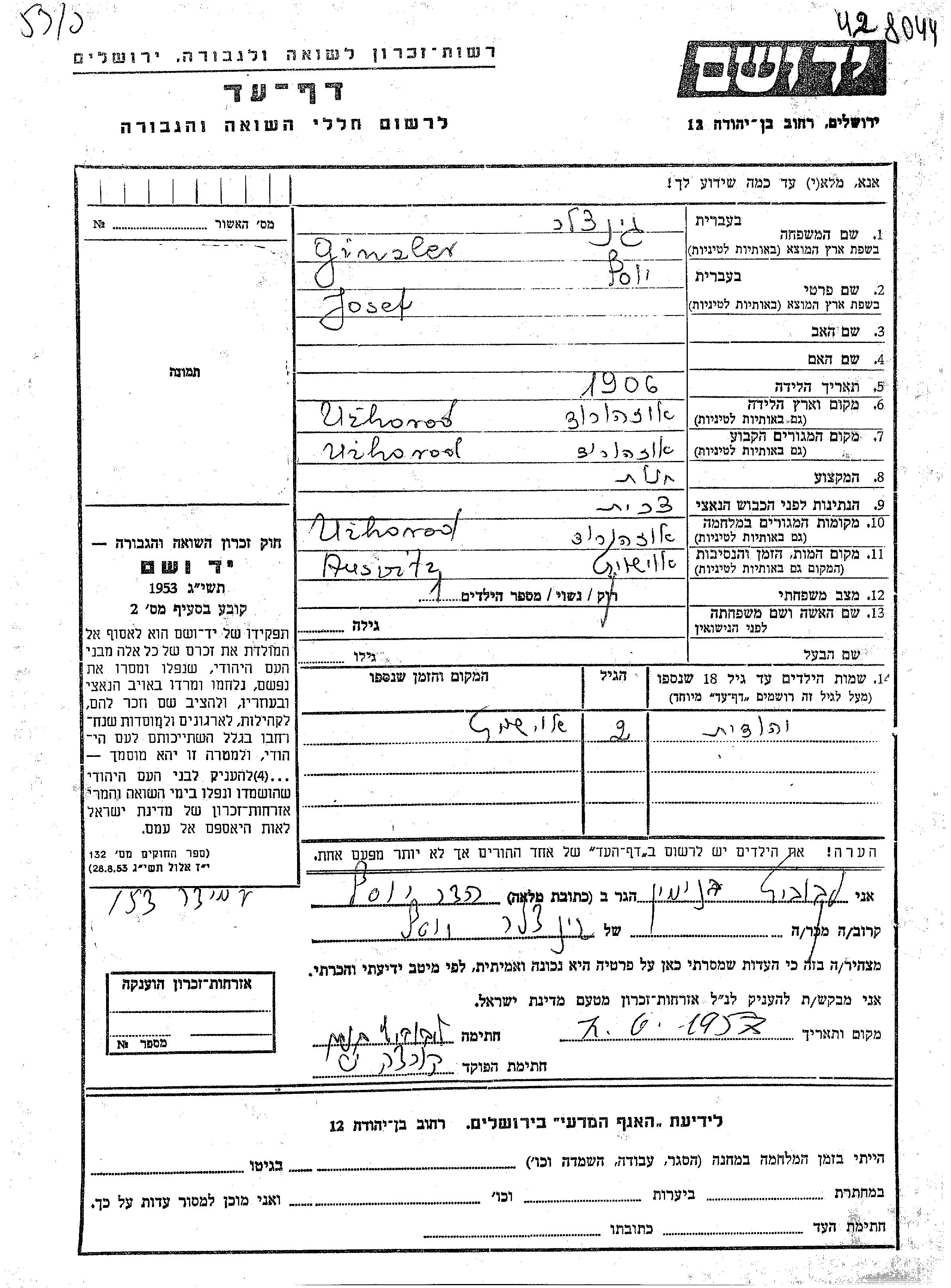 Ginzler Yehudit Uzhorod, Tchécoslovaquie Feuille de témoignage