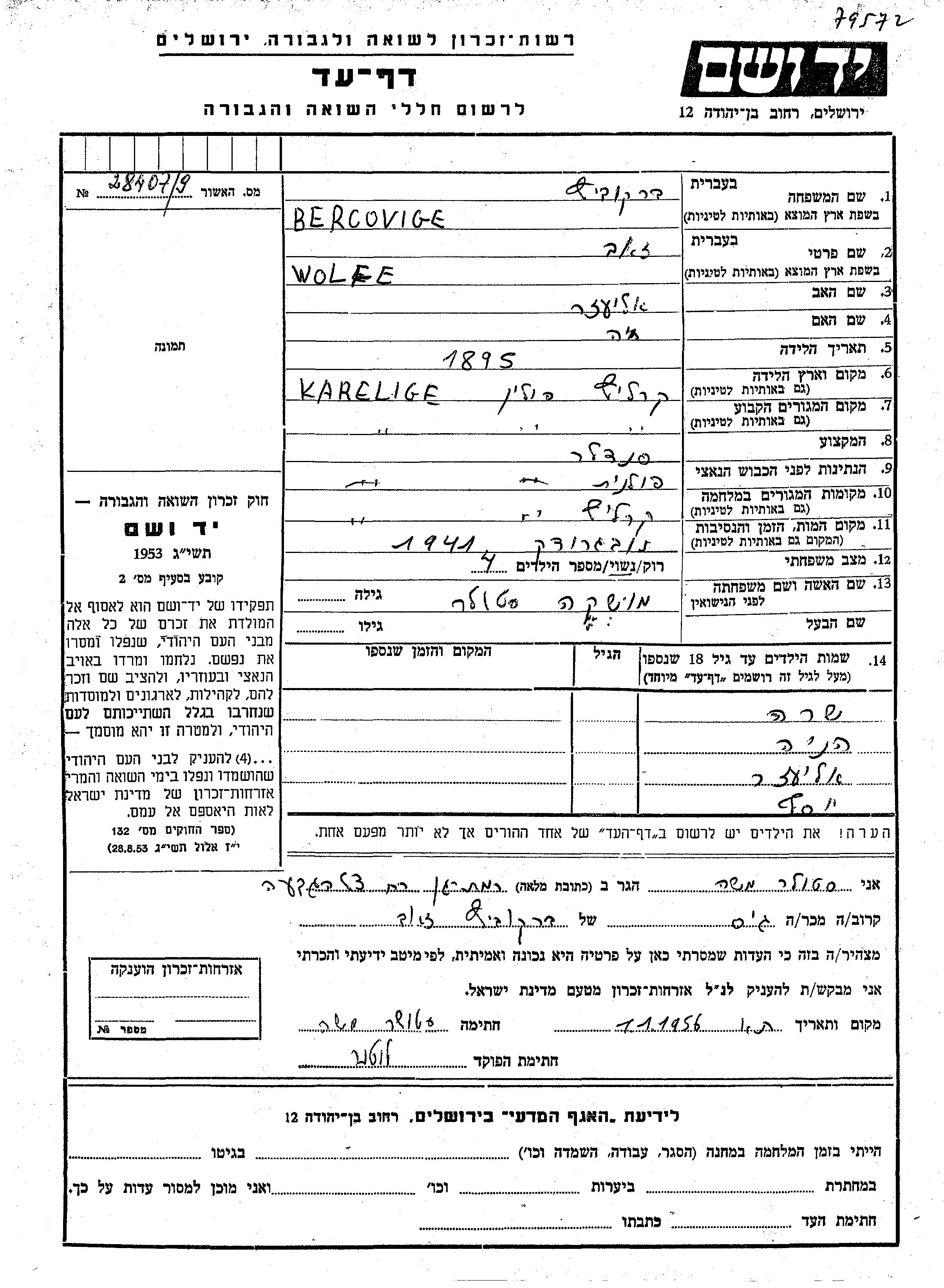 Bercovice Sara Karelic, Pologne Feuille de témoignage