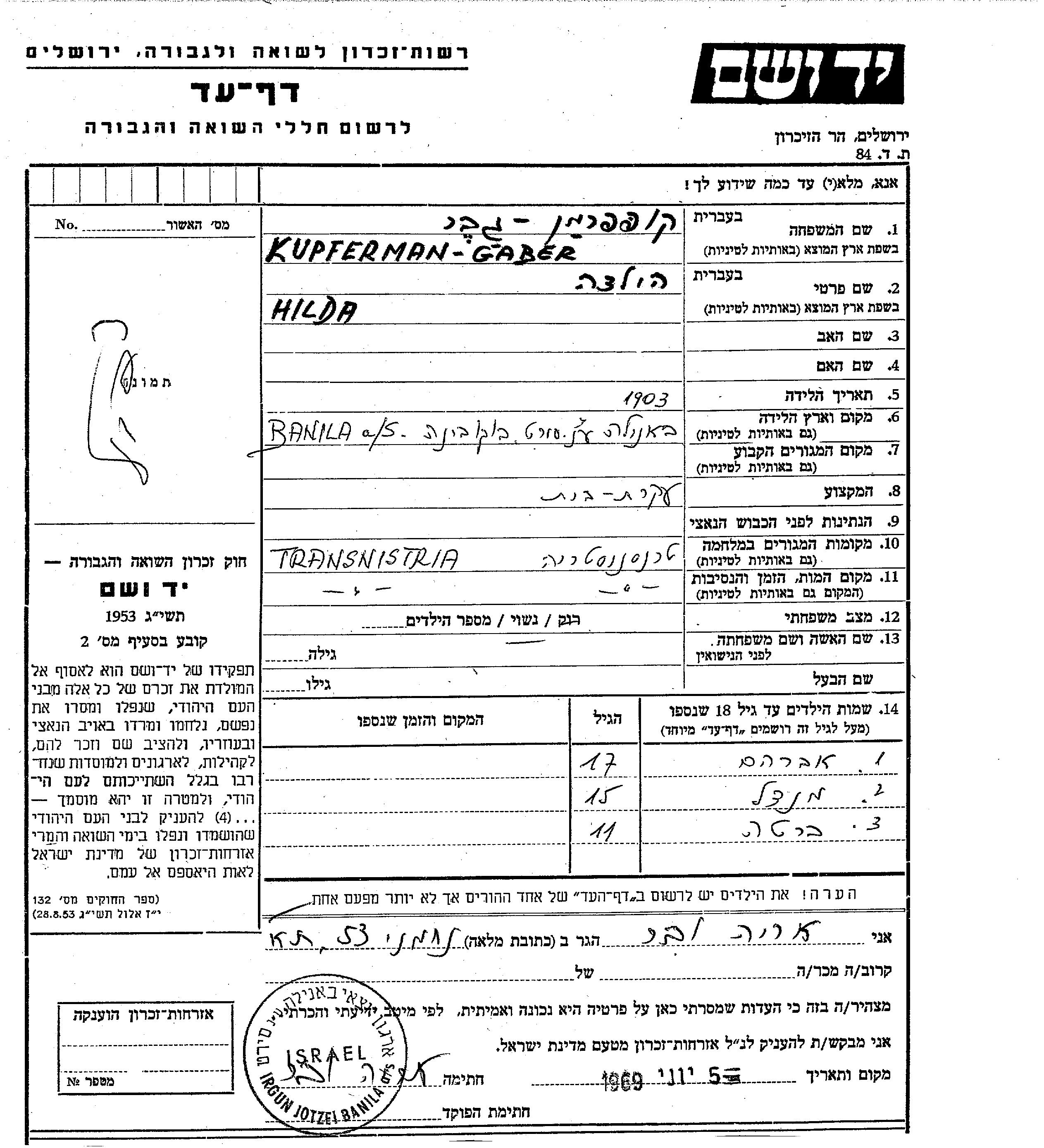 Kupferman Geber Avraham endroit inconnu, Feuille de témoignage
