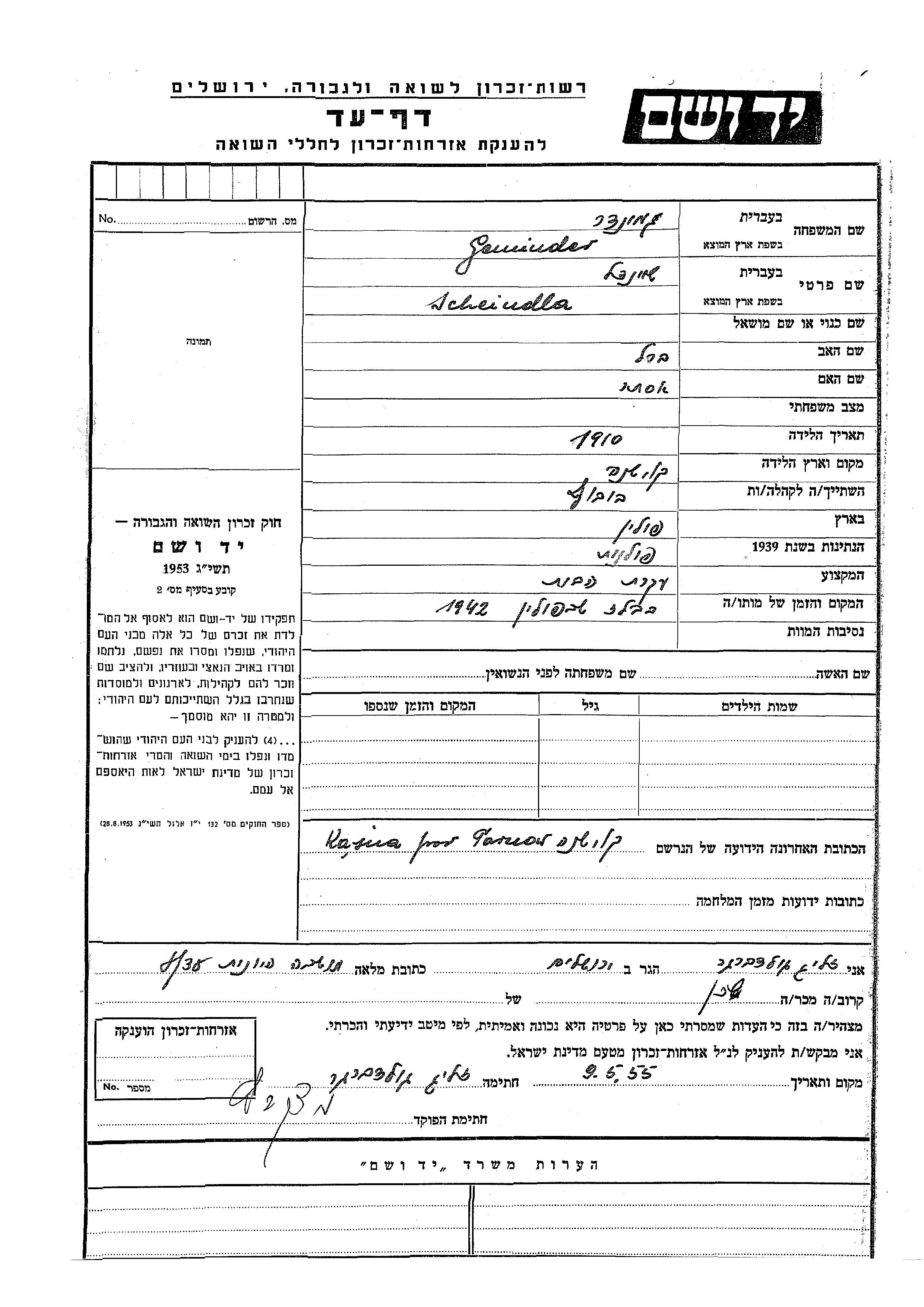 Geminder Scheindla 1910 endroit inconnu, Feuille de témoignage