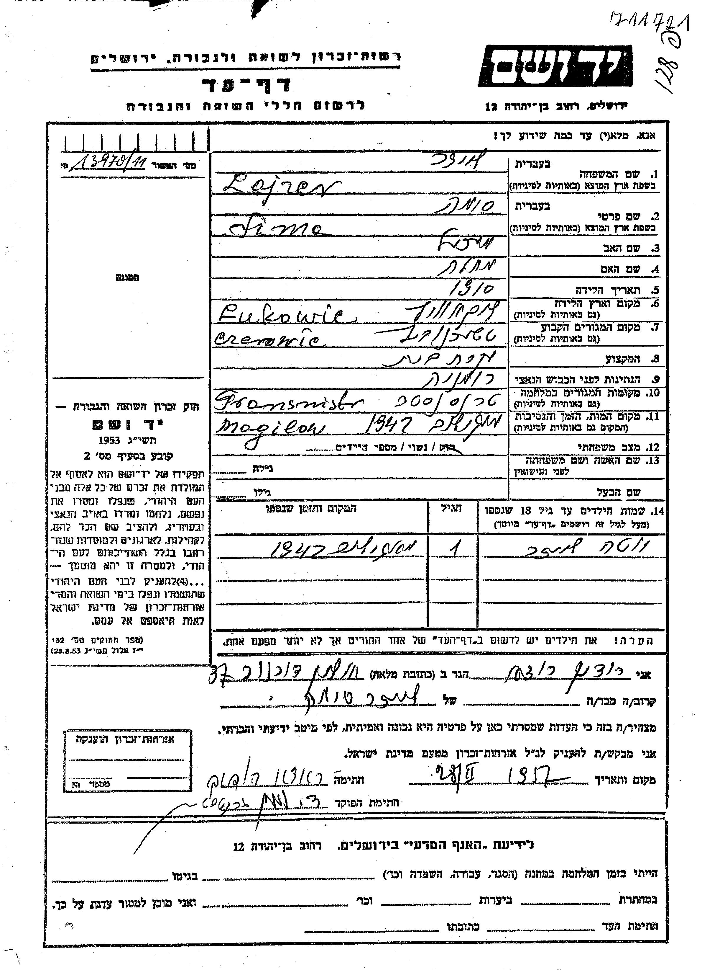 Lajzer Ita Czernowitz, Roumanie Feuille de témoignage