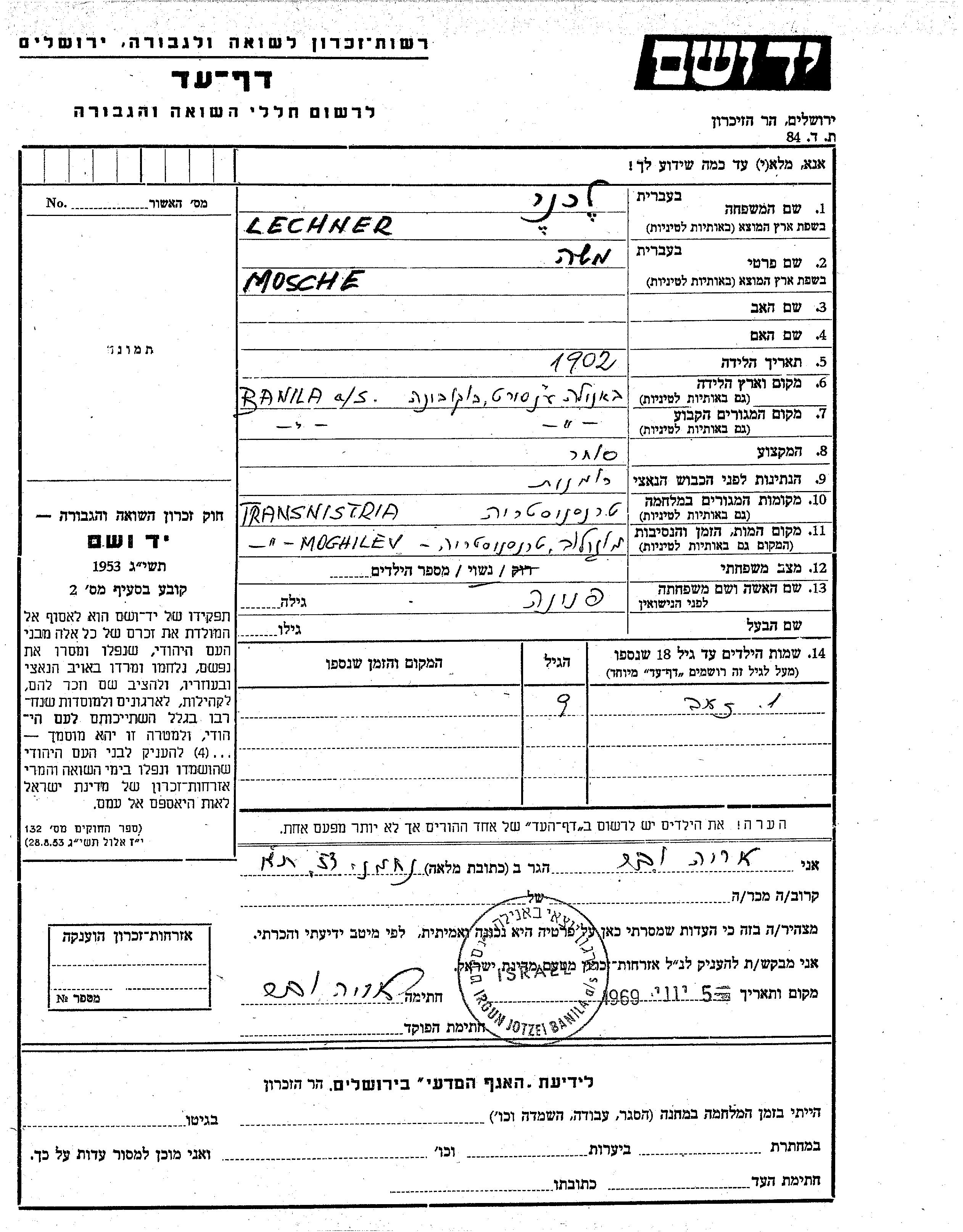 Lechner Zeev Banila Siret, Roumanie Feuille de témoignage
