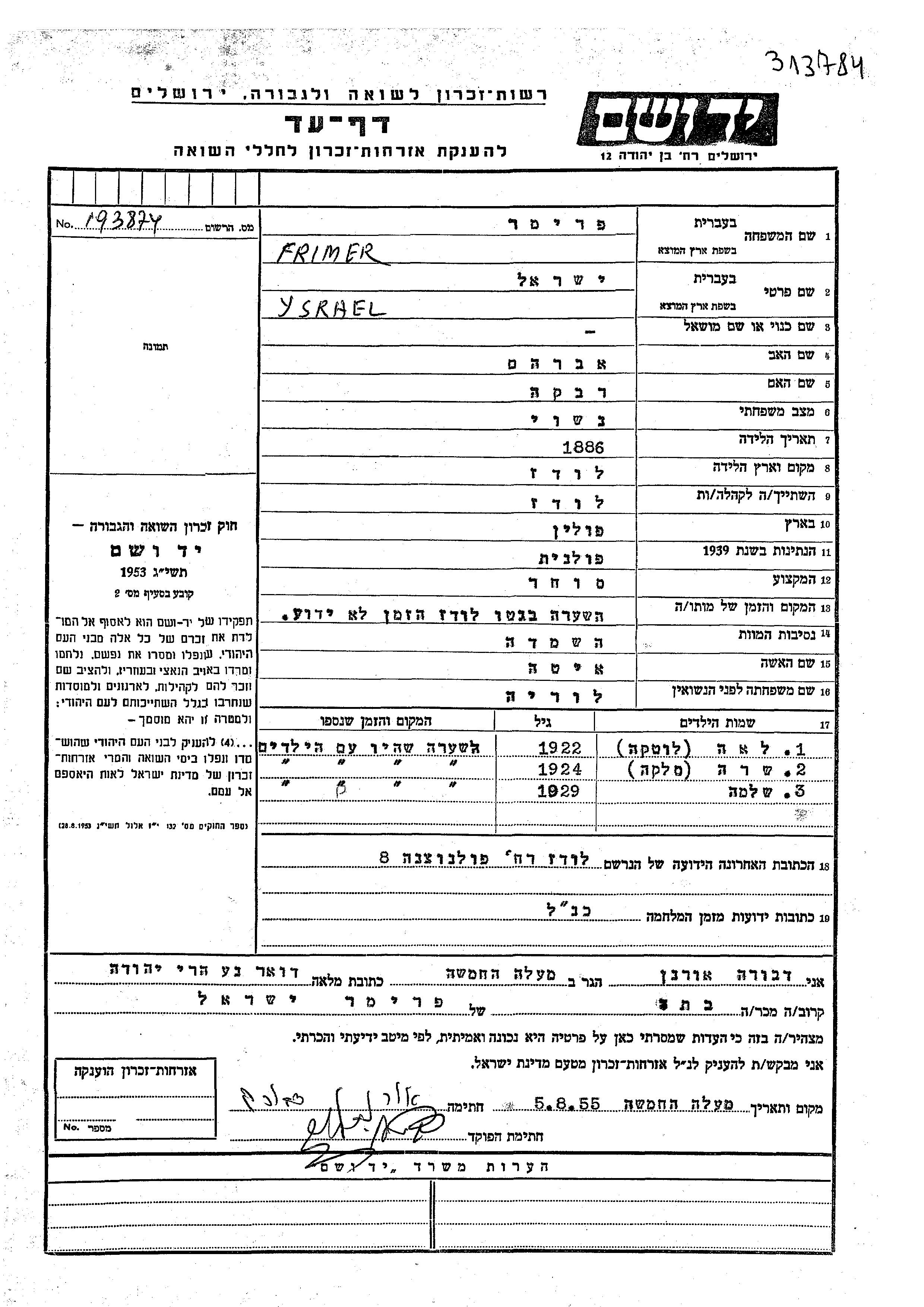 Frimer Lea Lotka 1922 Lodz, Pologne Feuille de témoignage