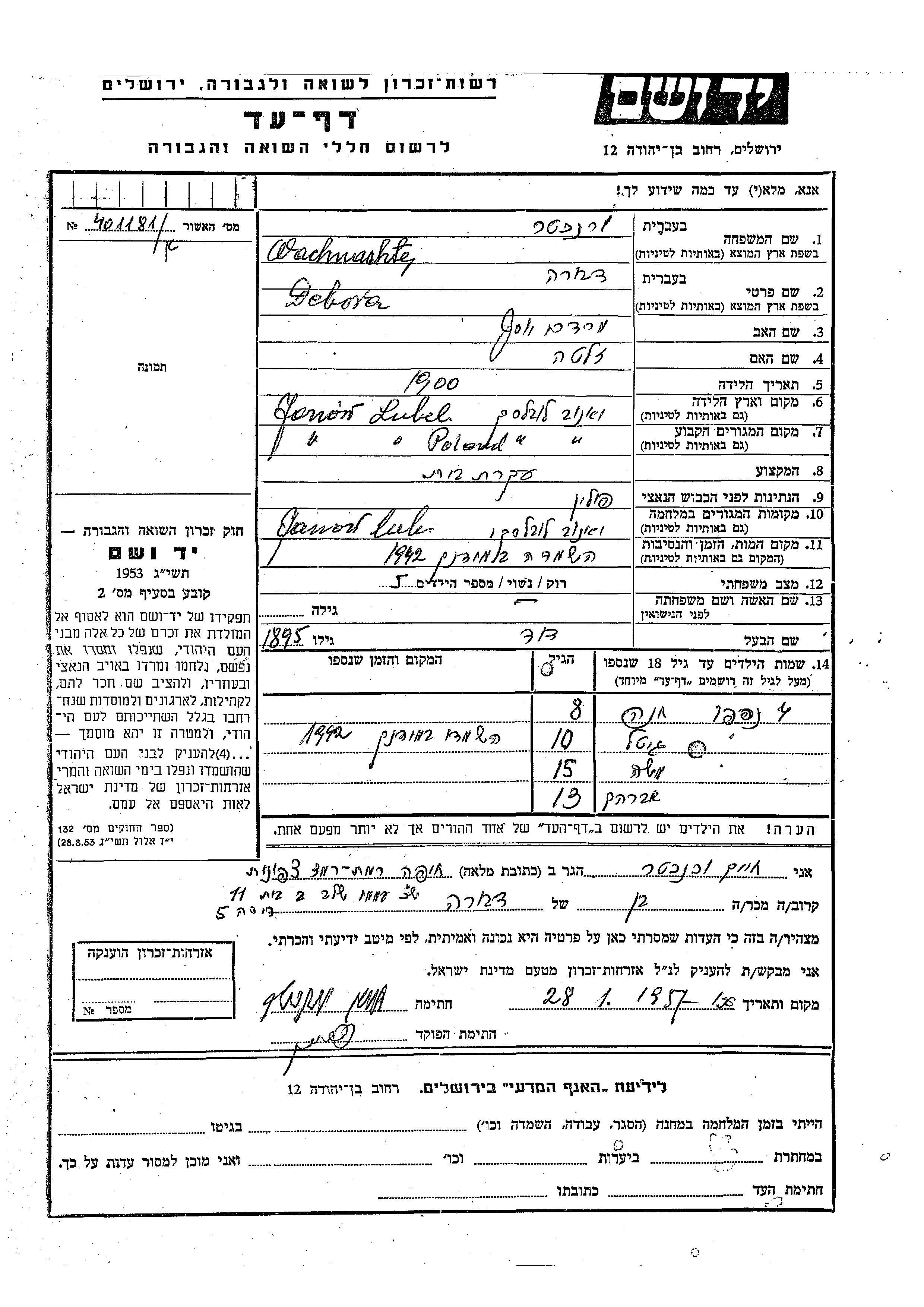 Wachnashter Moshe Janow, Pologne Feuille de témoignage