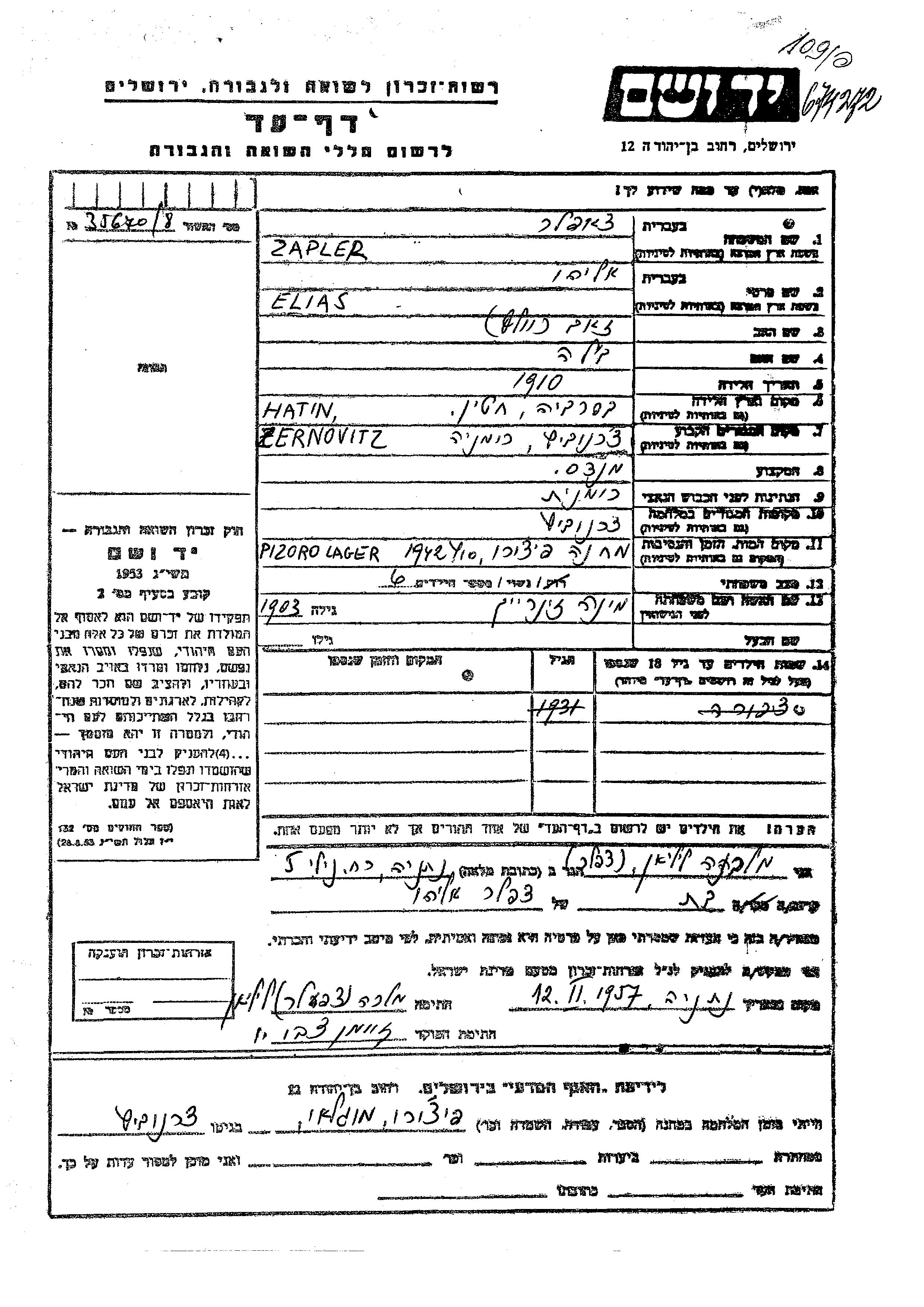 Zapler Tzipora 1931 Czernowitz, Roumanie Feuille de témoignage