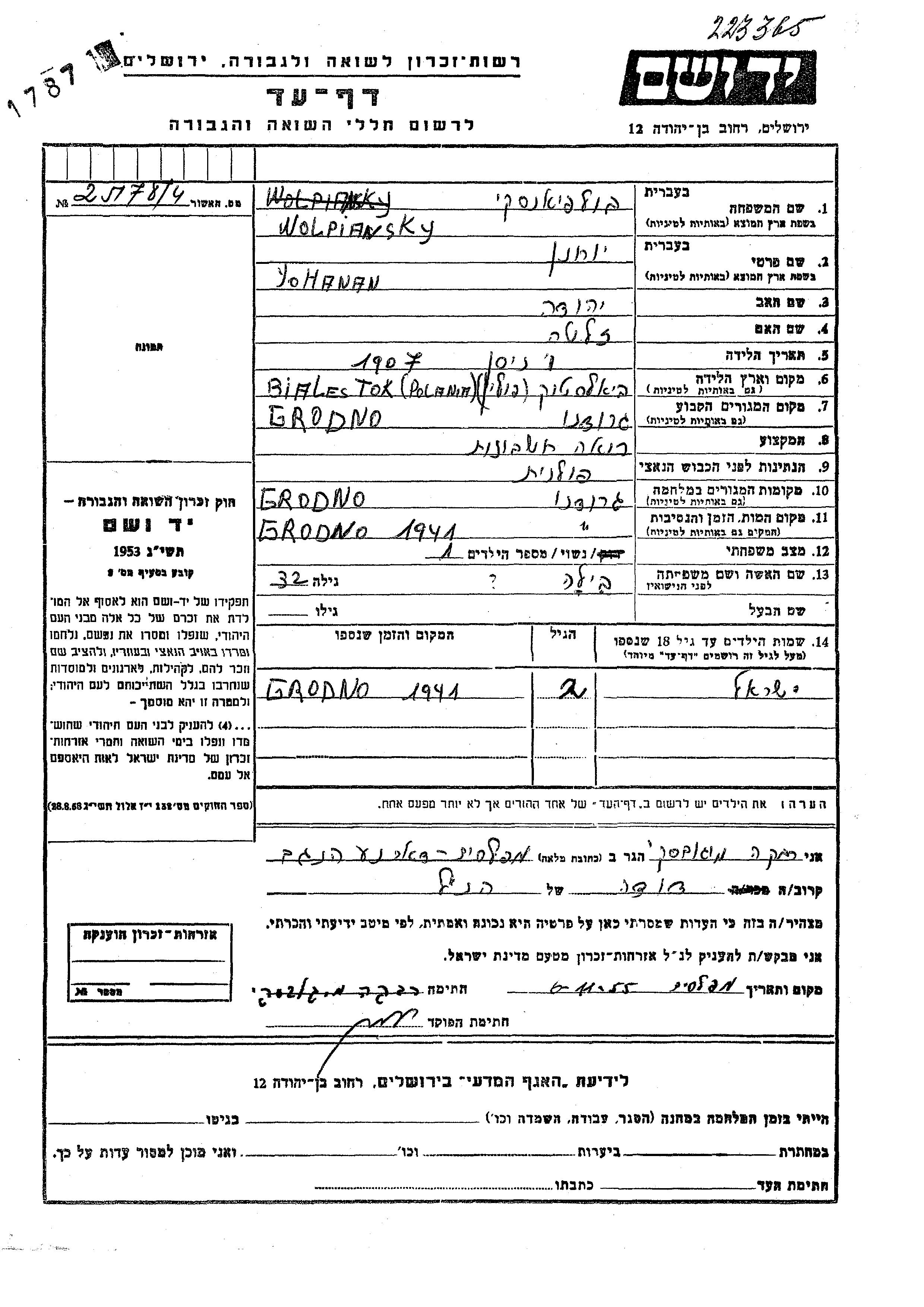Wolpiansky Yisrael Grodno, Pologne Feuille de témoignage