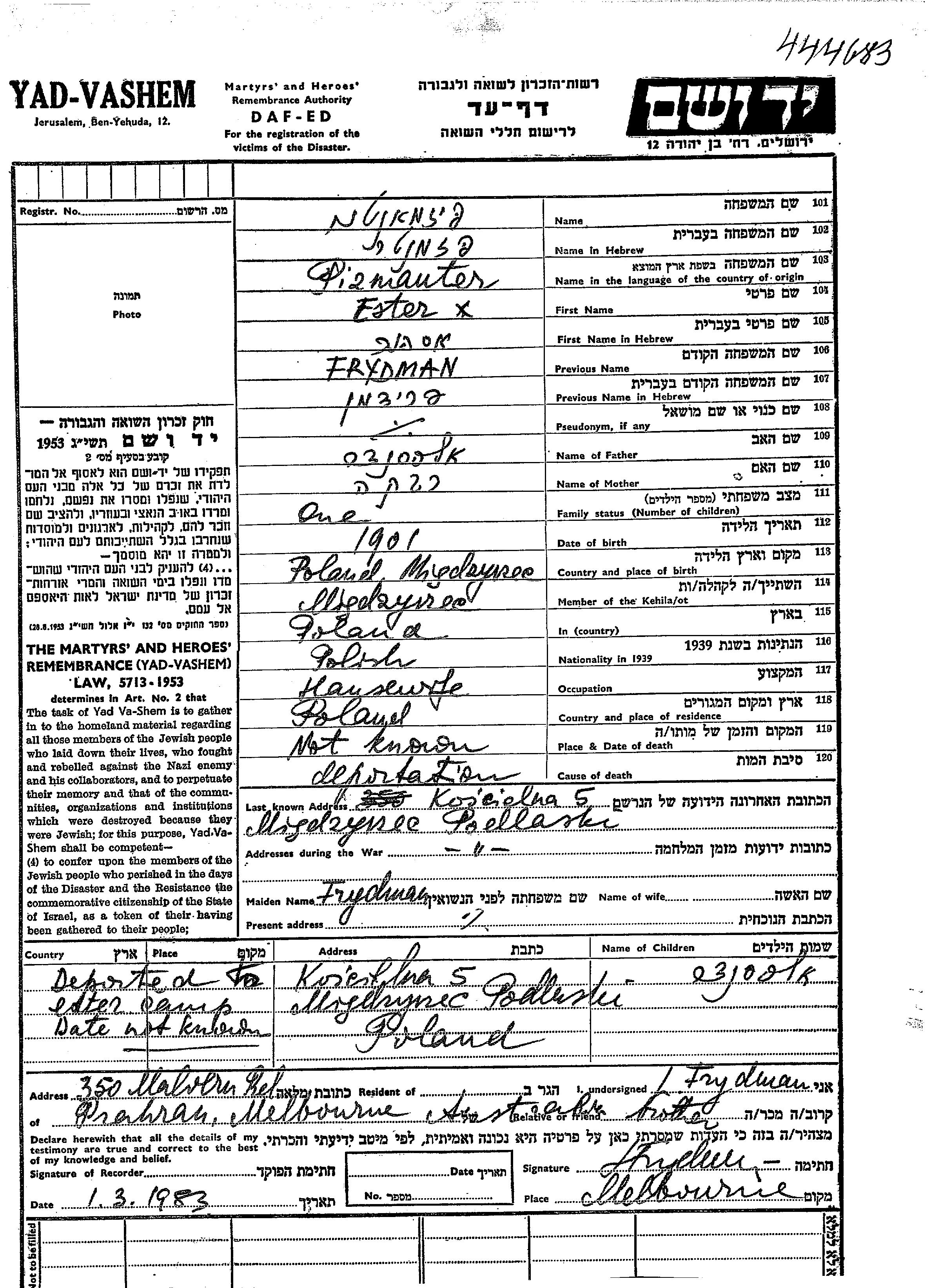 Aleksander Pizmanter est né fils de Ester née Frydman. Il était Enfant. Avant la seconde guerre mondiale il vivait à Miedzyrzec, Pologne. Au cours de la guerre, il était à Miedzyrzec, Pologne.