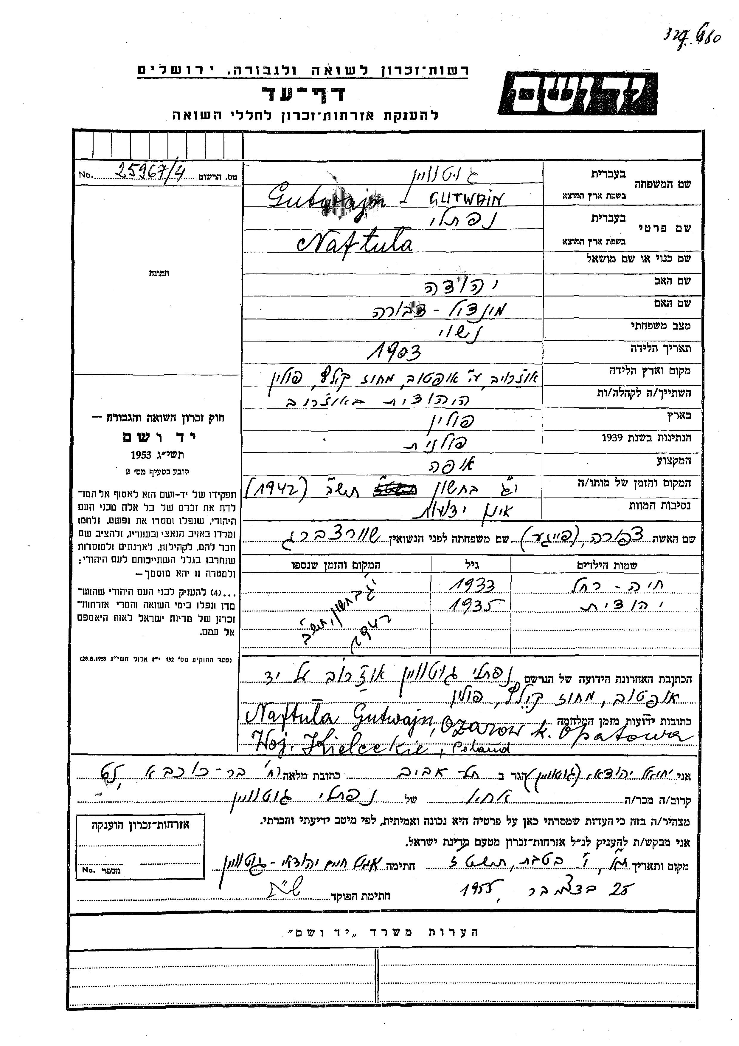 Gutwain Naftula 1903 Ozarow, Pologne Feuille de témoignage