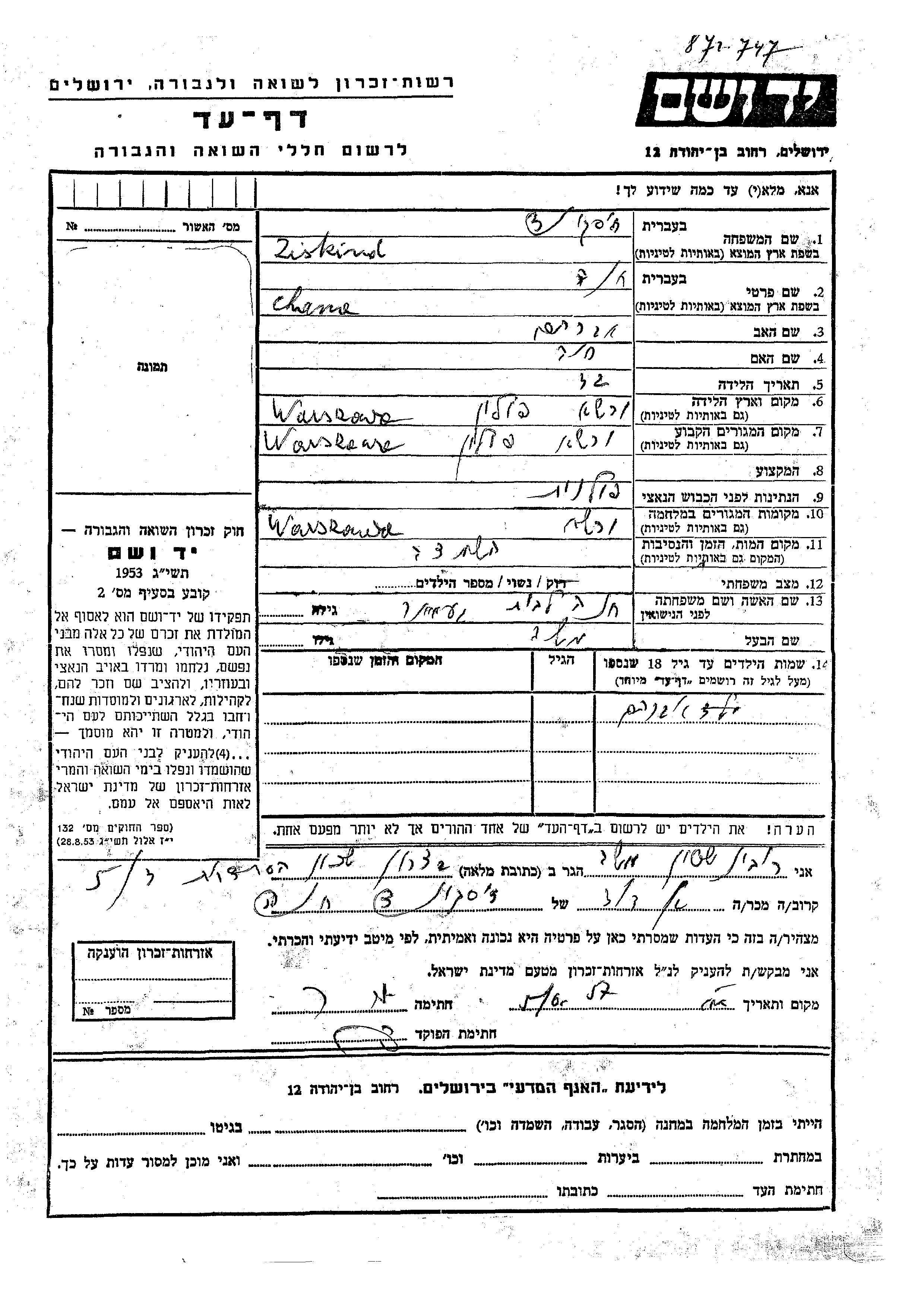 Ziskind Avraham Warsaw, Pologne Feuille de témoignage