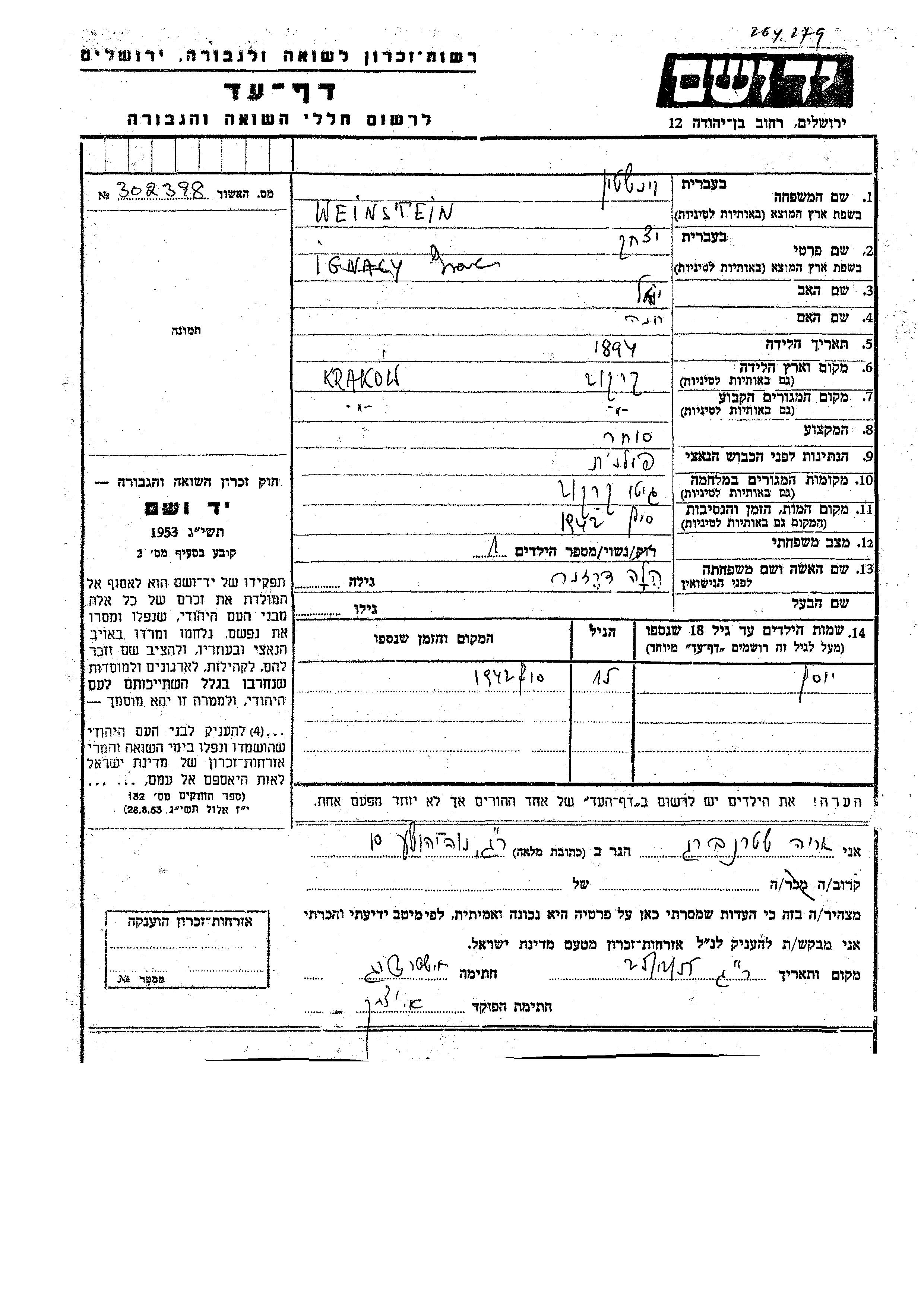 Weinstein Yosef Krakow, Pologne Feuille de témoignage