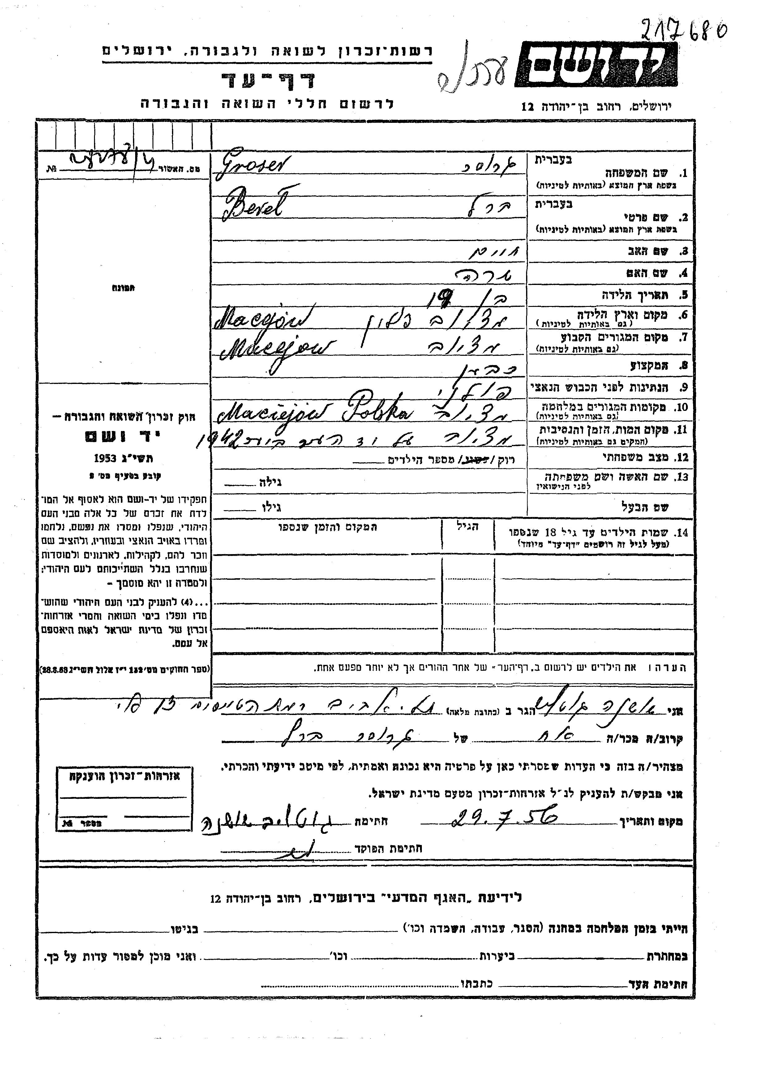 Groser Berl Maciejow, Pologne Feuille de témoignage