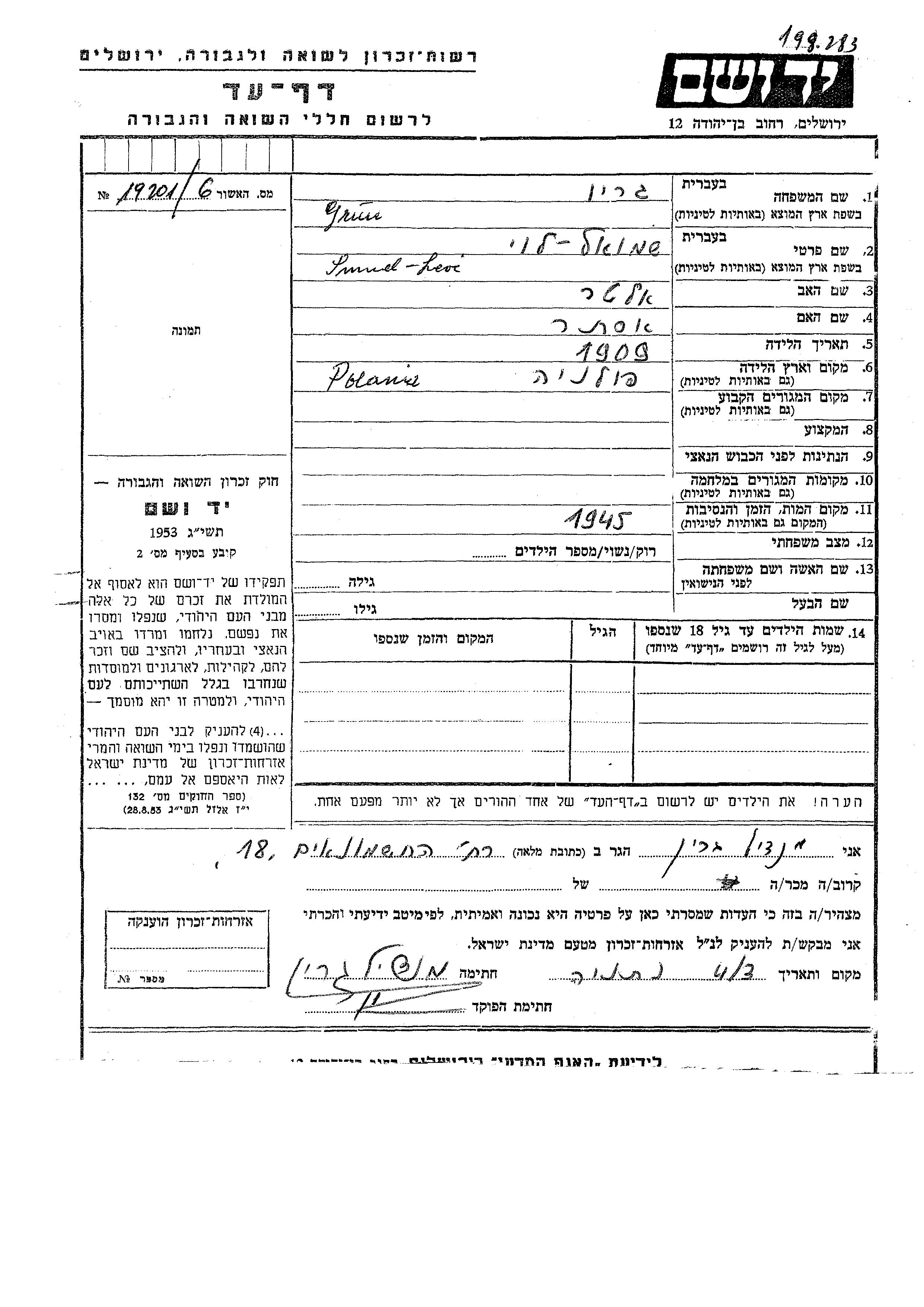 Yad Vashem - Pages of Testimony Names Memorial Collection
