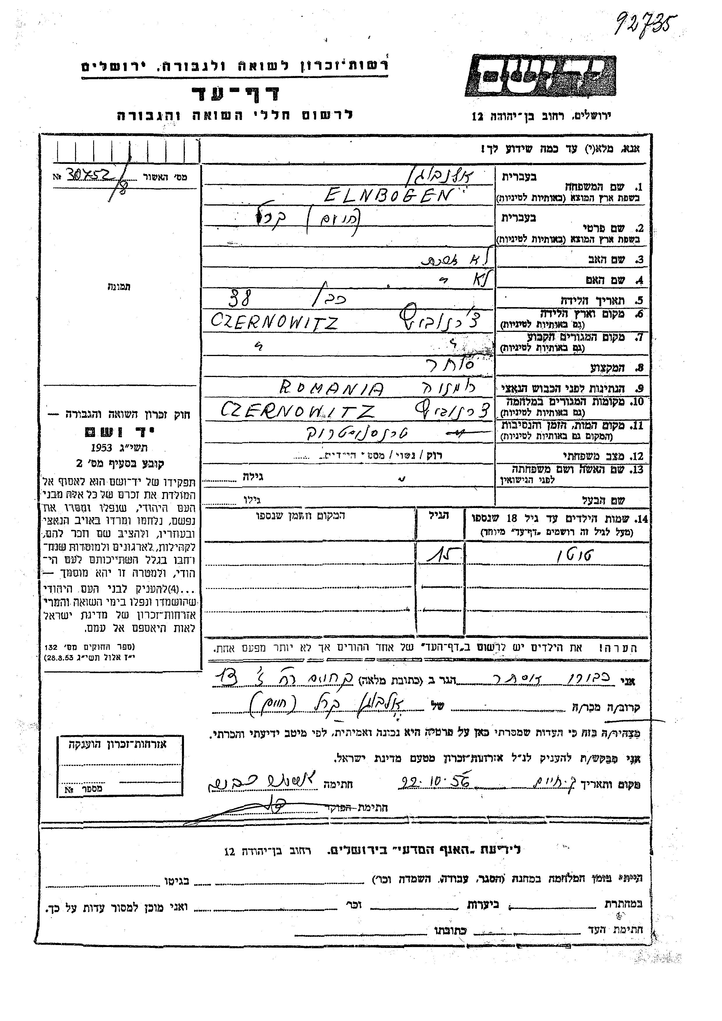 Elnbogen Karl Khaim Czernowitz, Roumanie Feuille de témoignage