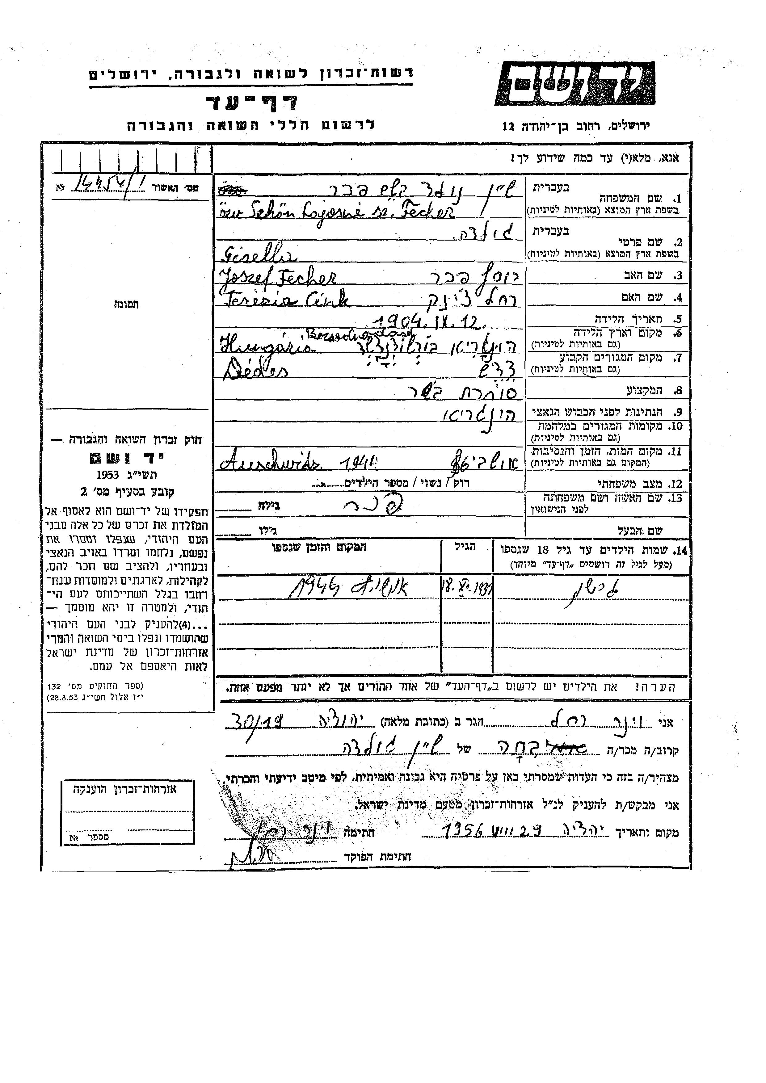 Gershon Schon Shein est né en 1931, fils de Gizella Golda née Fecker Pekher. Il était Enfant. Avant la seconde guerre mondiale il vivait à Dedes, Hongrie.