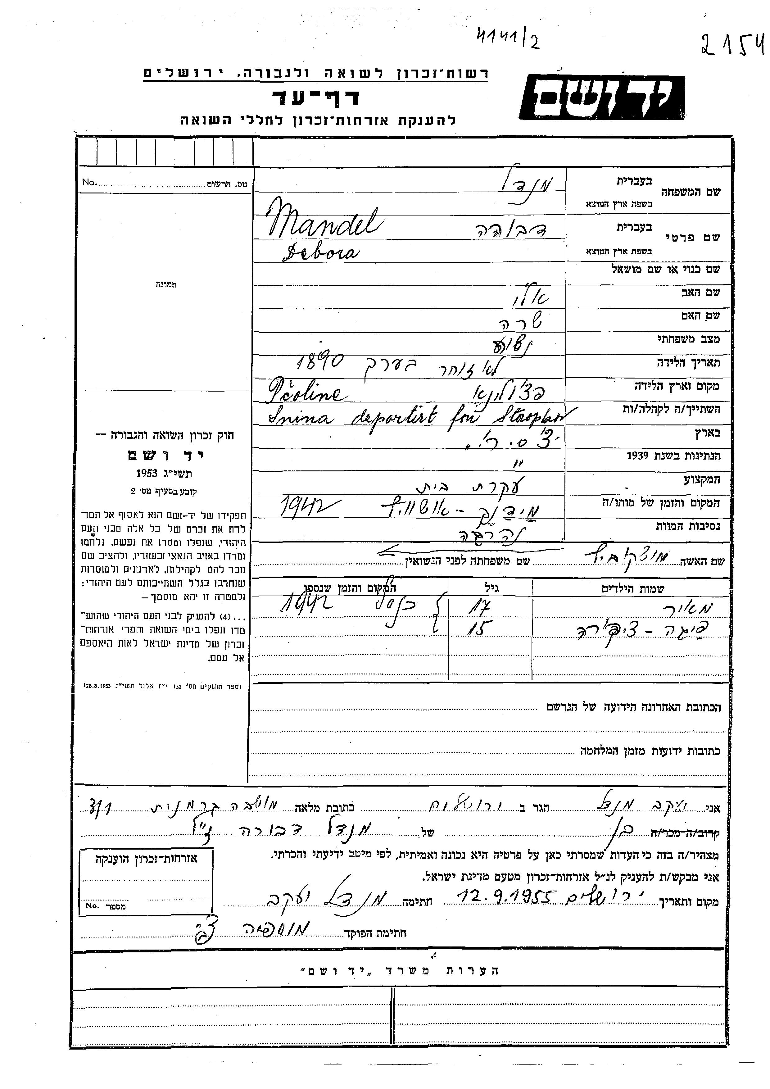 Yad Vashem - Pages of Testimony Names Memorial Collection