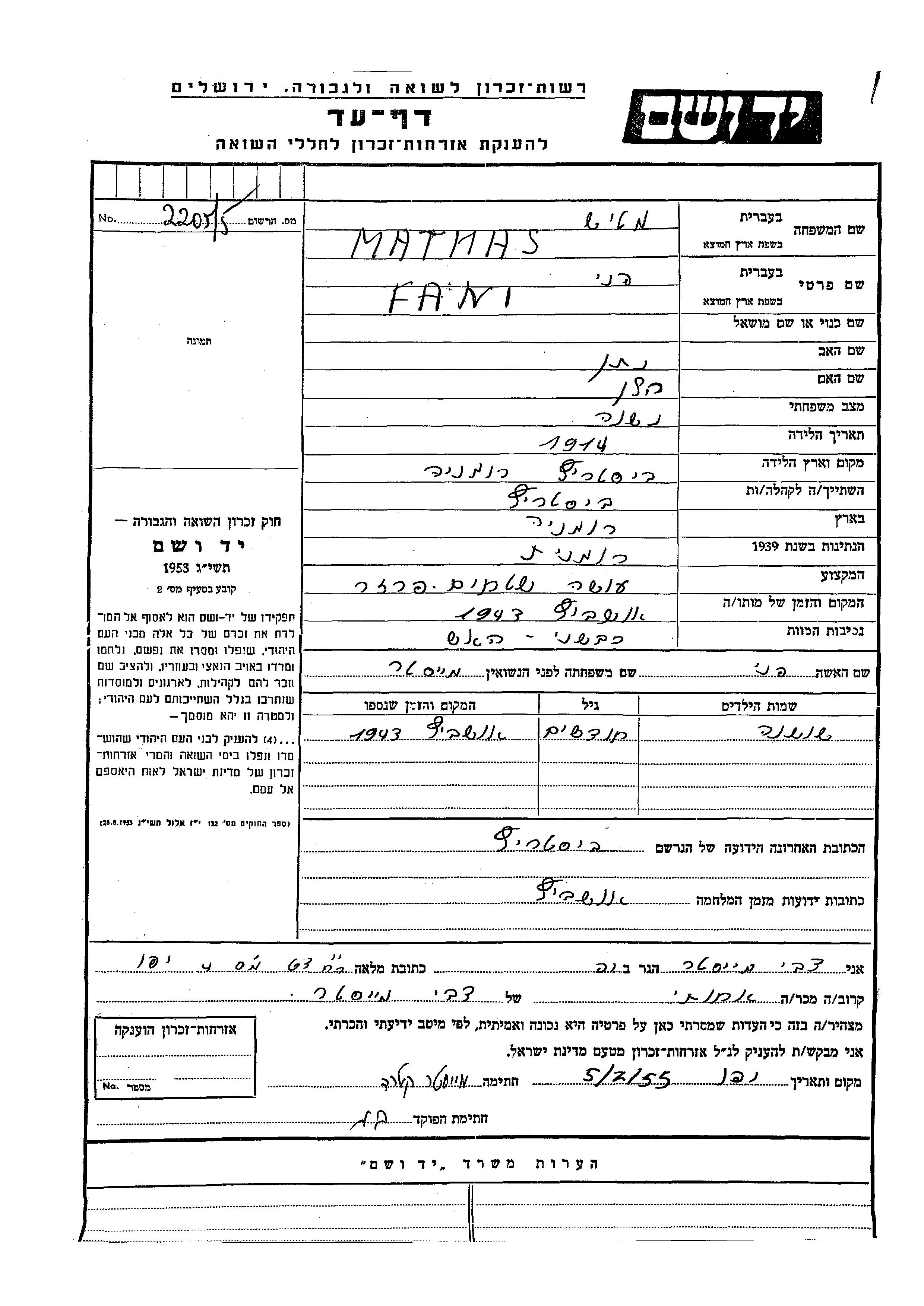 Matias Shoshana Bistrita, Roumanie Feuille de témoignage
