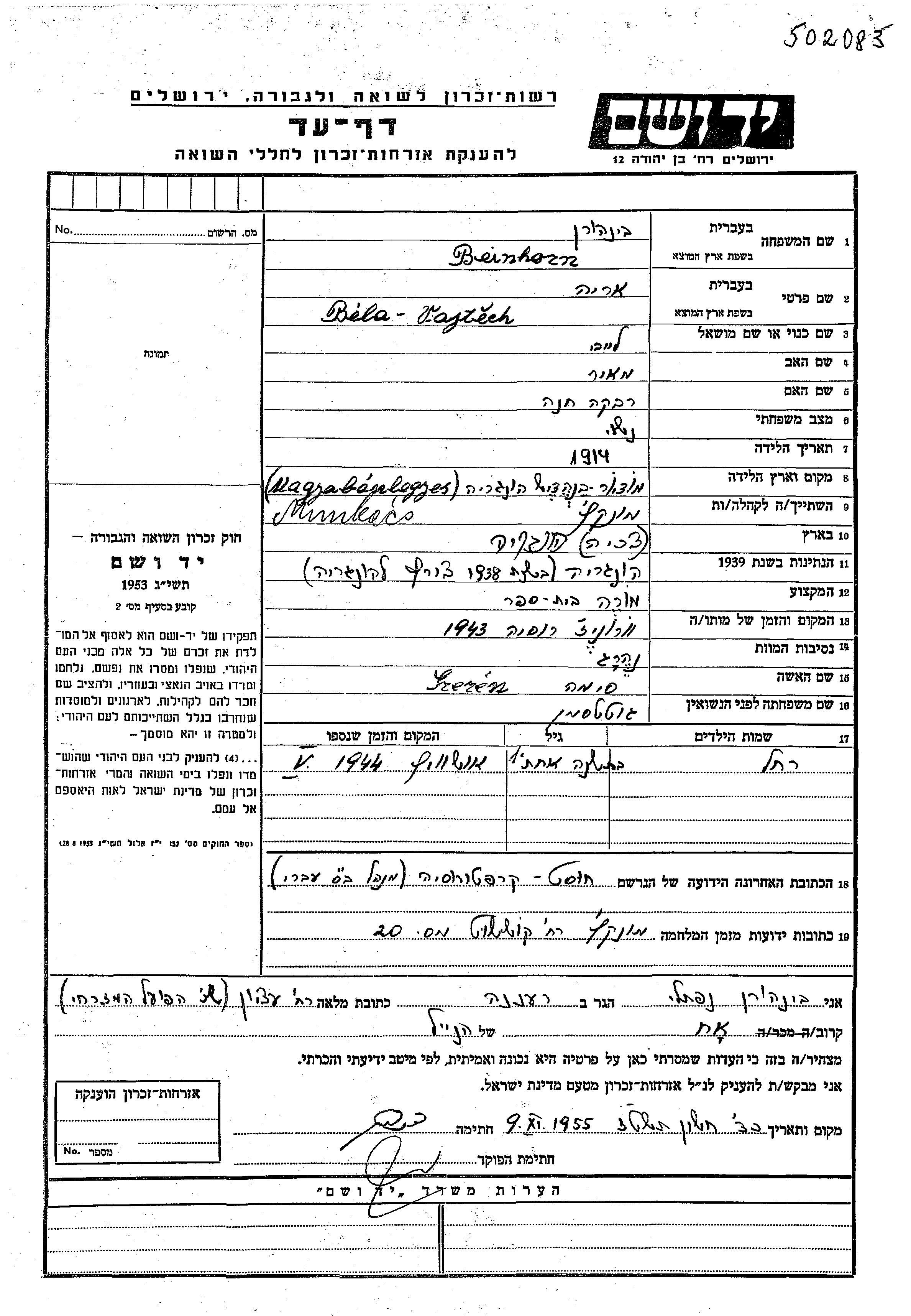 Beinhorn Rakhel Muncaci, Tchécoslovaquie Feuille de témoignage