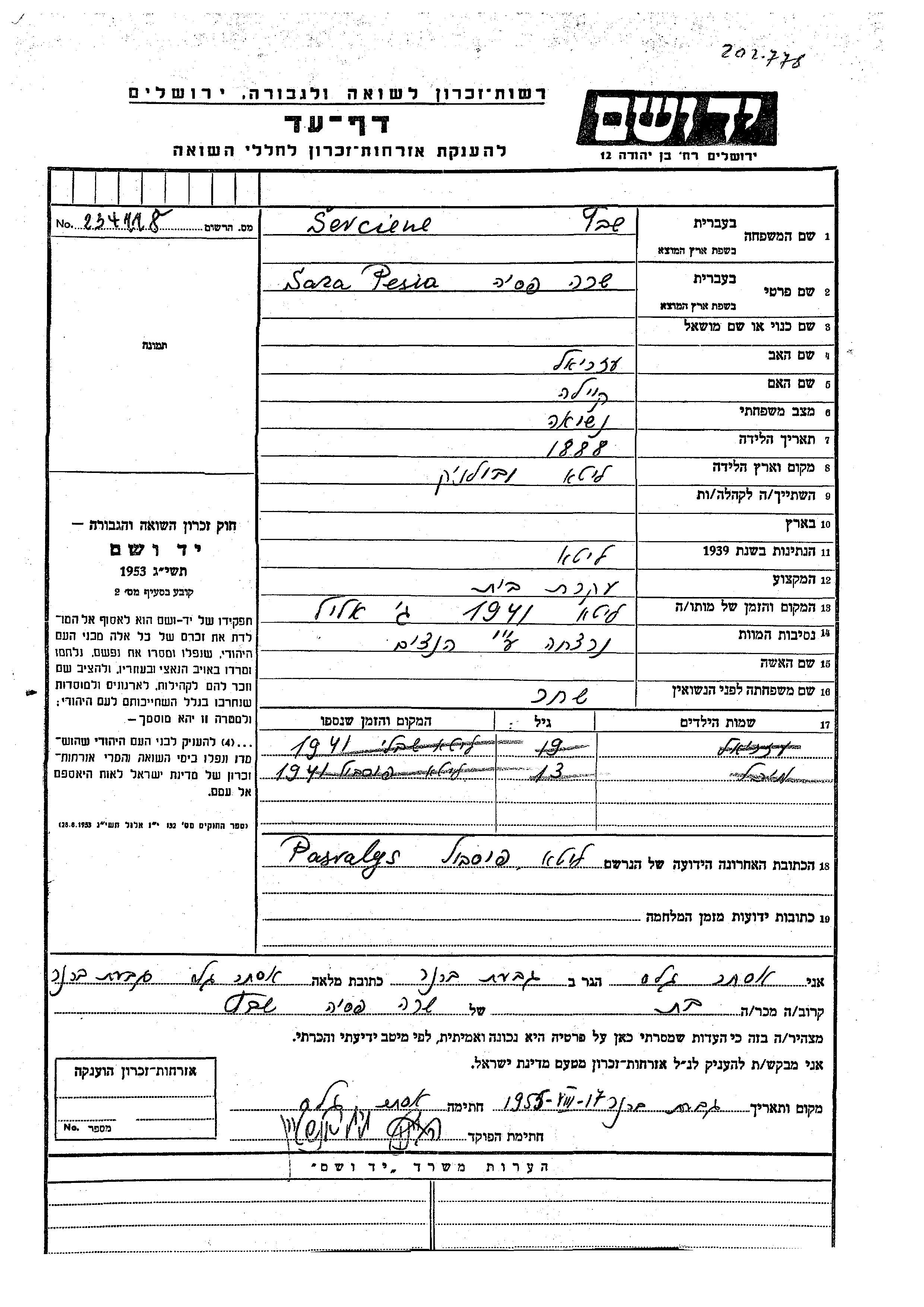 Yad Vashem - Pages of Testimony Names Memorial Collection