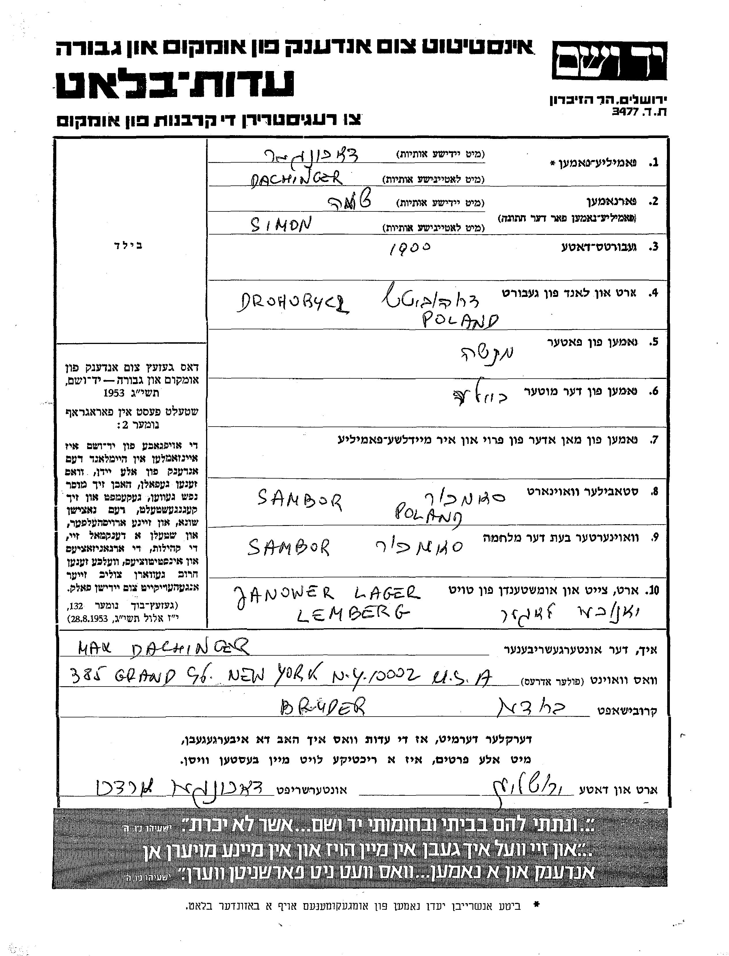 Dachinger Simon Shima 1900 Sambor, Pologne Feuille de témoignage
