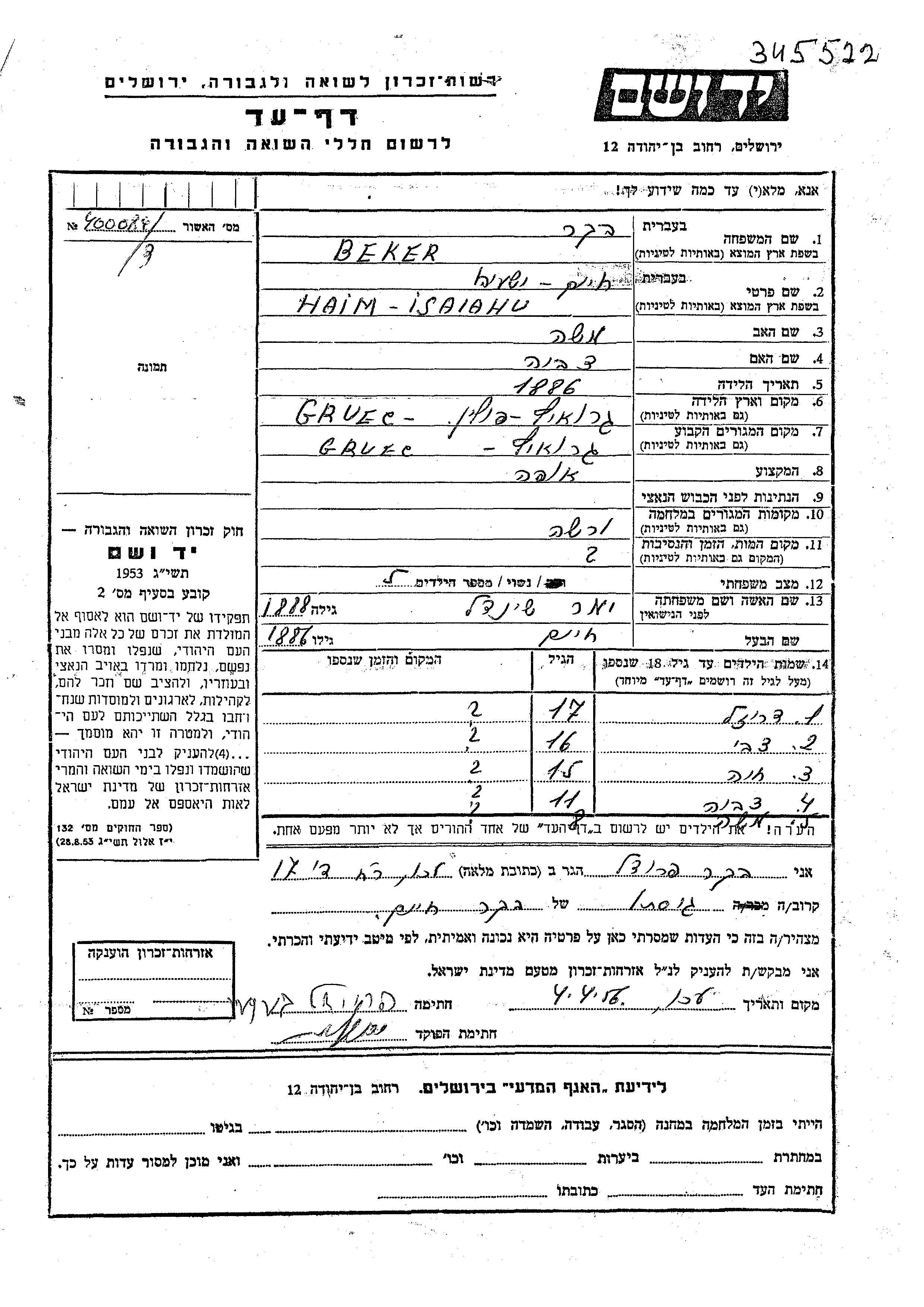 Beker Tzvi Grojec, Pologne Feuille de témoignage