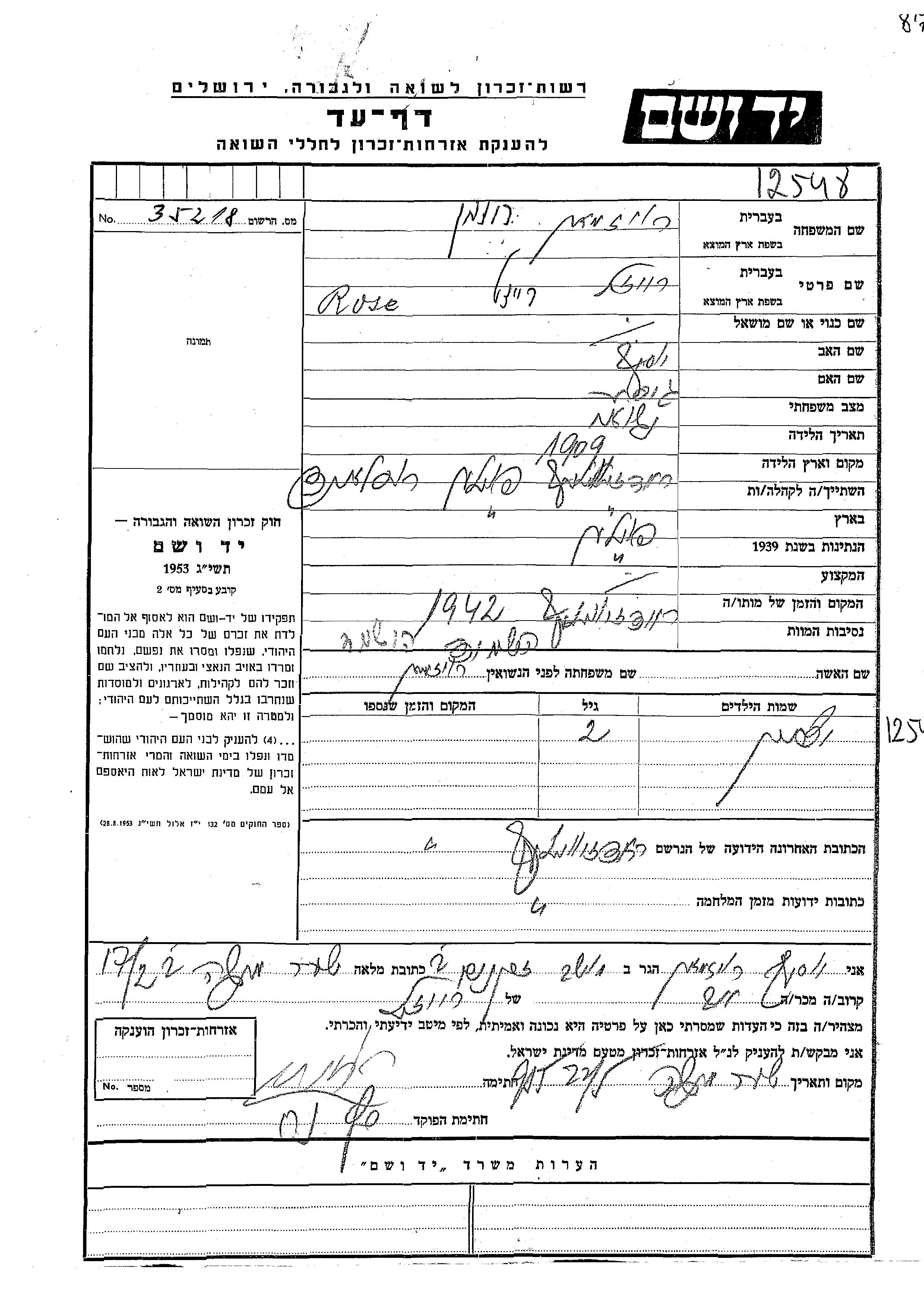 Rozman Yitzkhak Radziwillow, Pologne Feuille de témoignage
