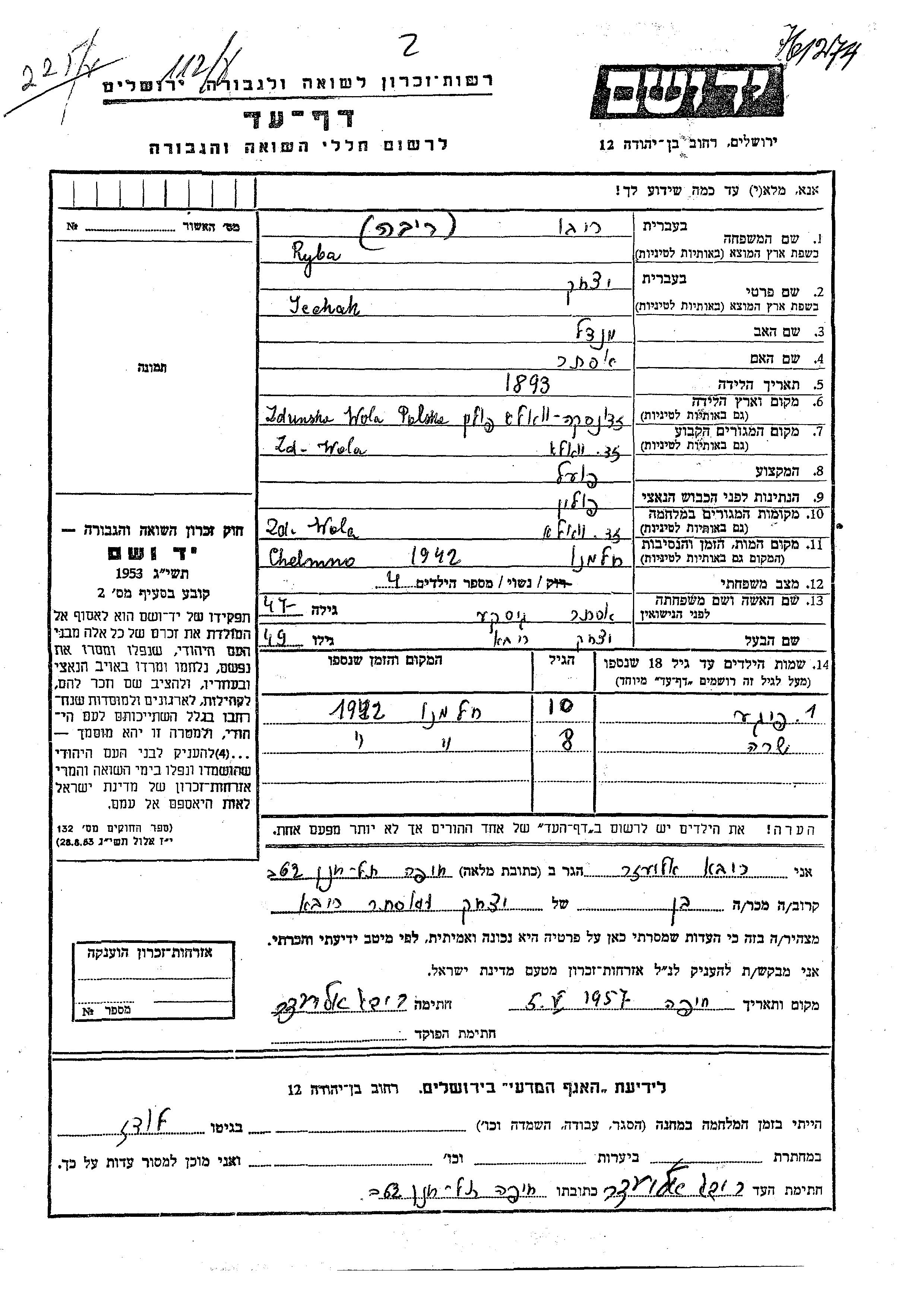 Ryba Ribo Feiga Zdunska Wola, Pologne Feuille de témoignage