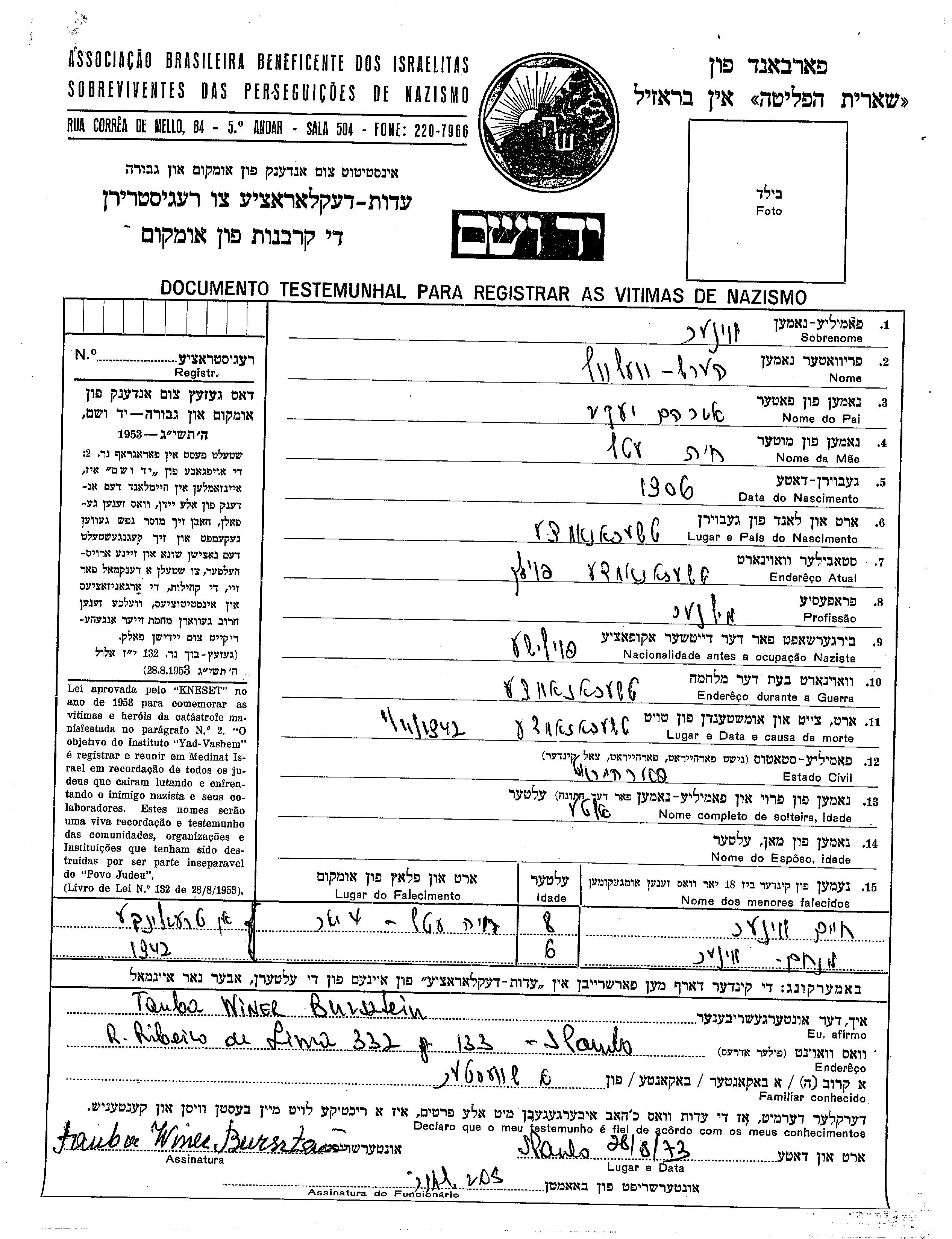 Khaim Viner est né fils de Hersh Velvel et de Etel. Il était Enfant. Avant la seconde guerre mondiale il vivait à Chechanovitz, Pologne. Au cours de la guerre, il était à Chechanovitz, Pologne.