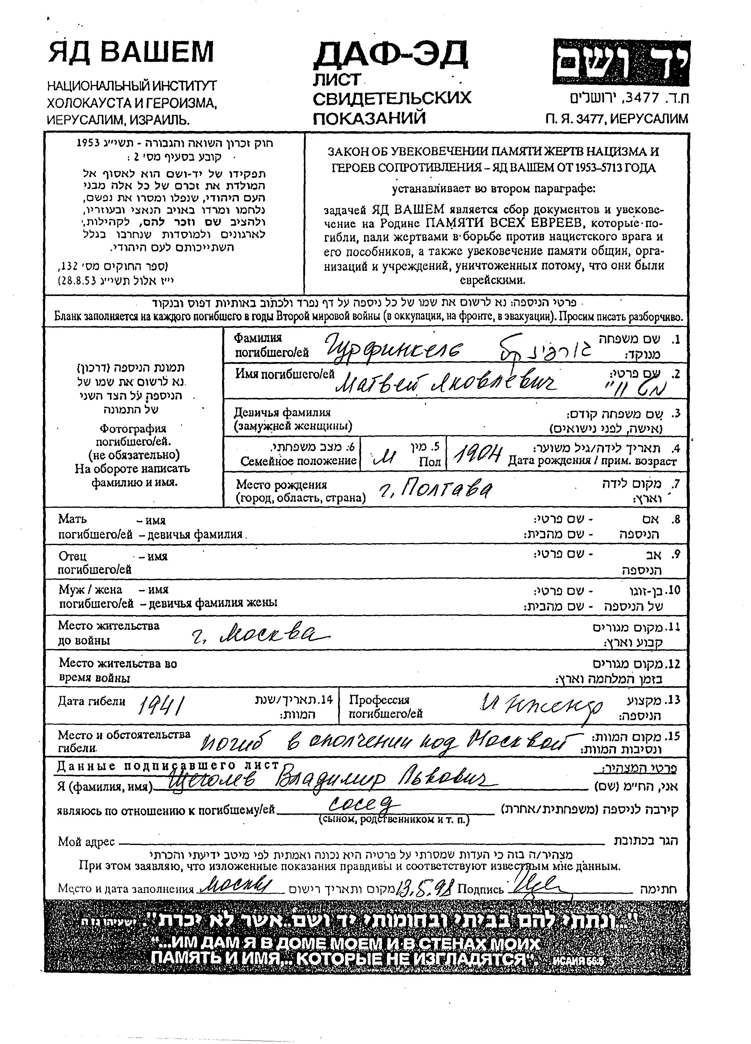 Gurfinkel Matvei 1904 Moskva, Russie (URSS) Feuille de témoignage