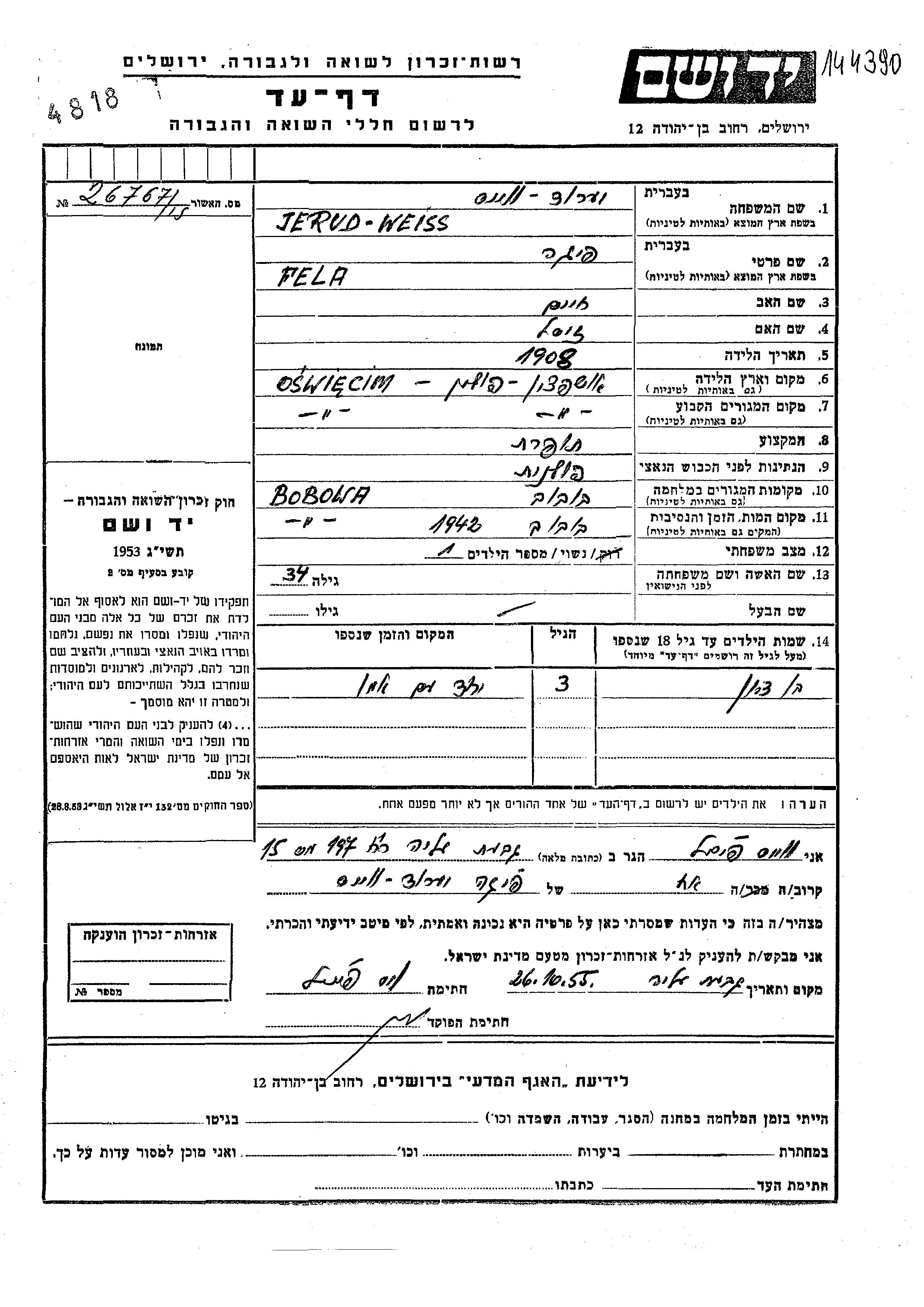 Jerud Bentzion Auschwitz, Pologne Feuille de témoignage