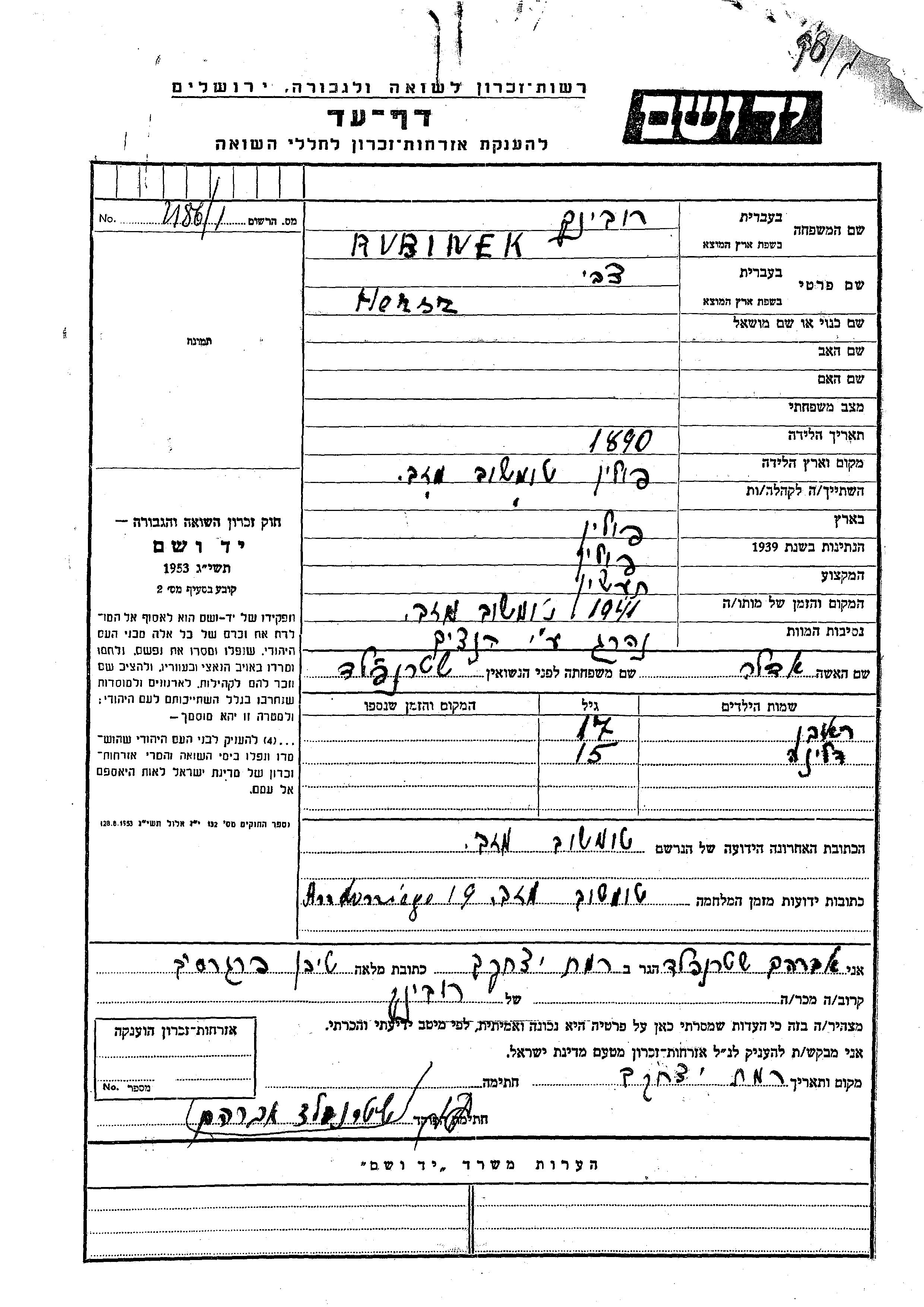 Rubinek Reuven Tomaszow Mazowiecki, Pologne Feuille de témoignage