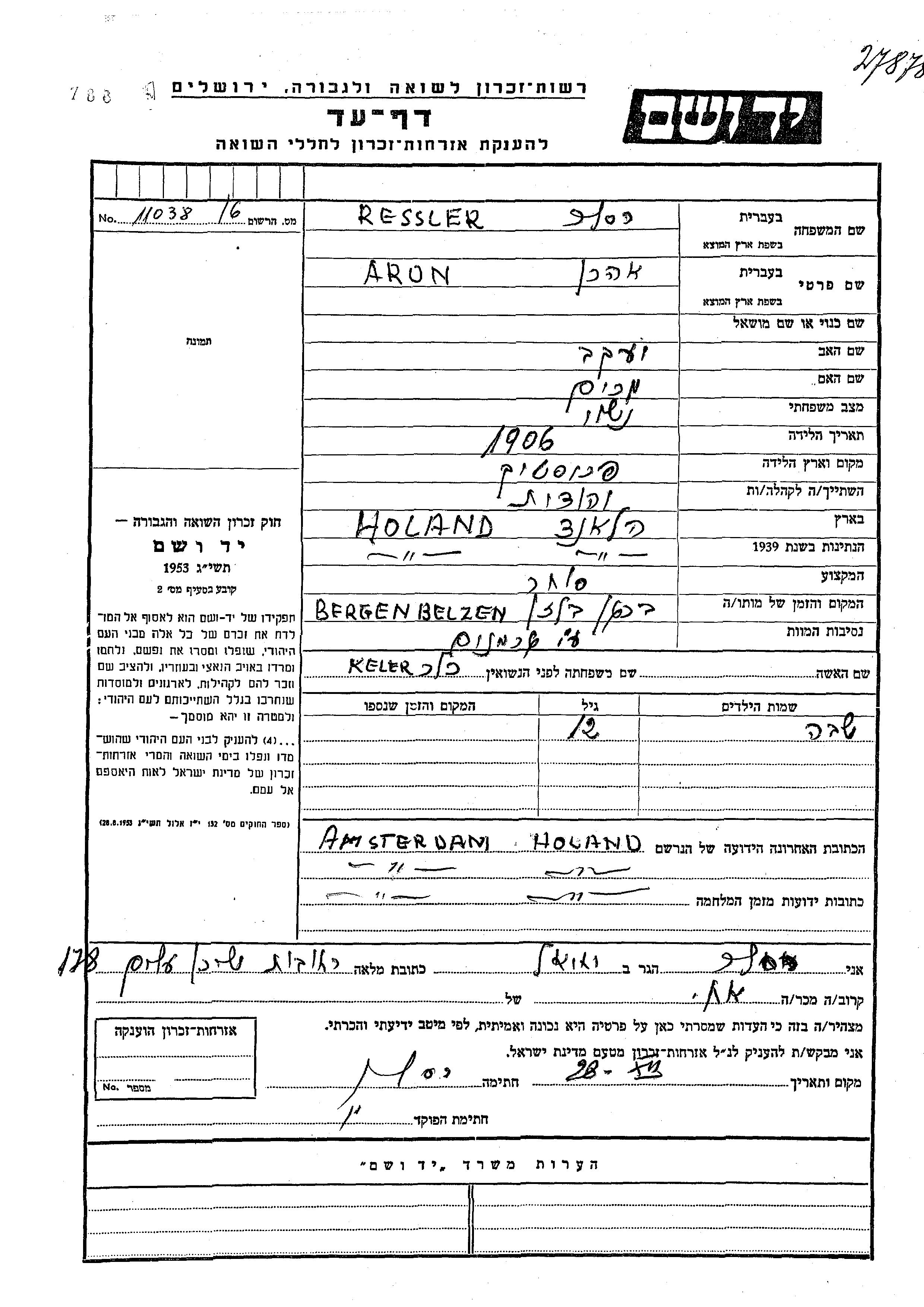 Ressler Sheva Amsterdam, Pays-Bas Feuille de témoignage