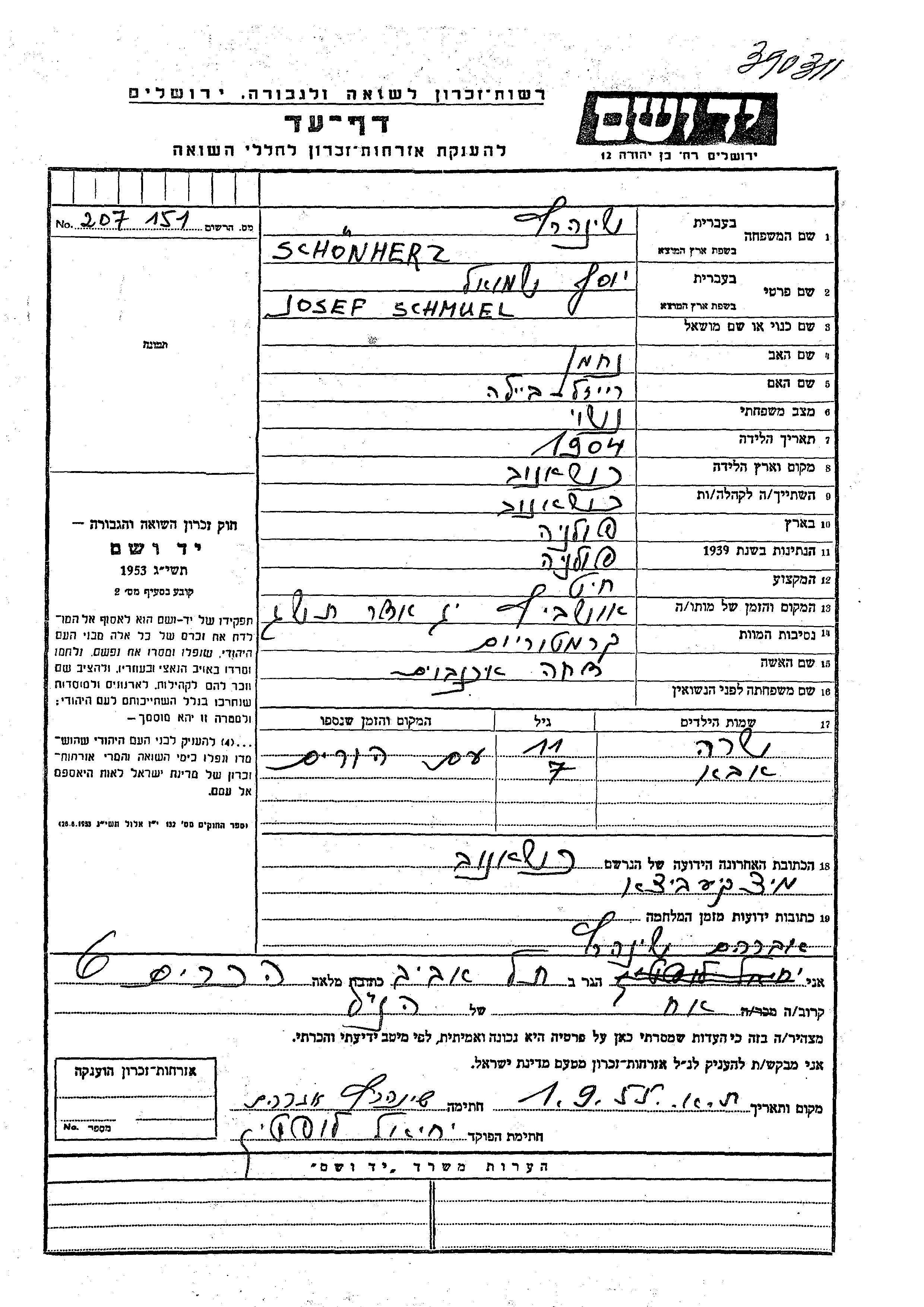 Yad Vashem - Pages of Testimony Names Memorial Collection