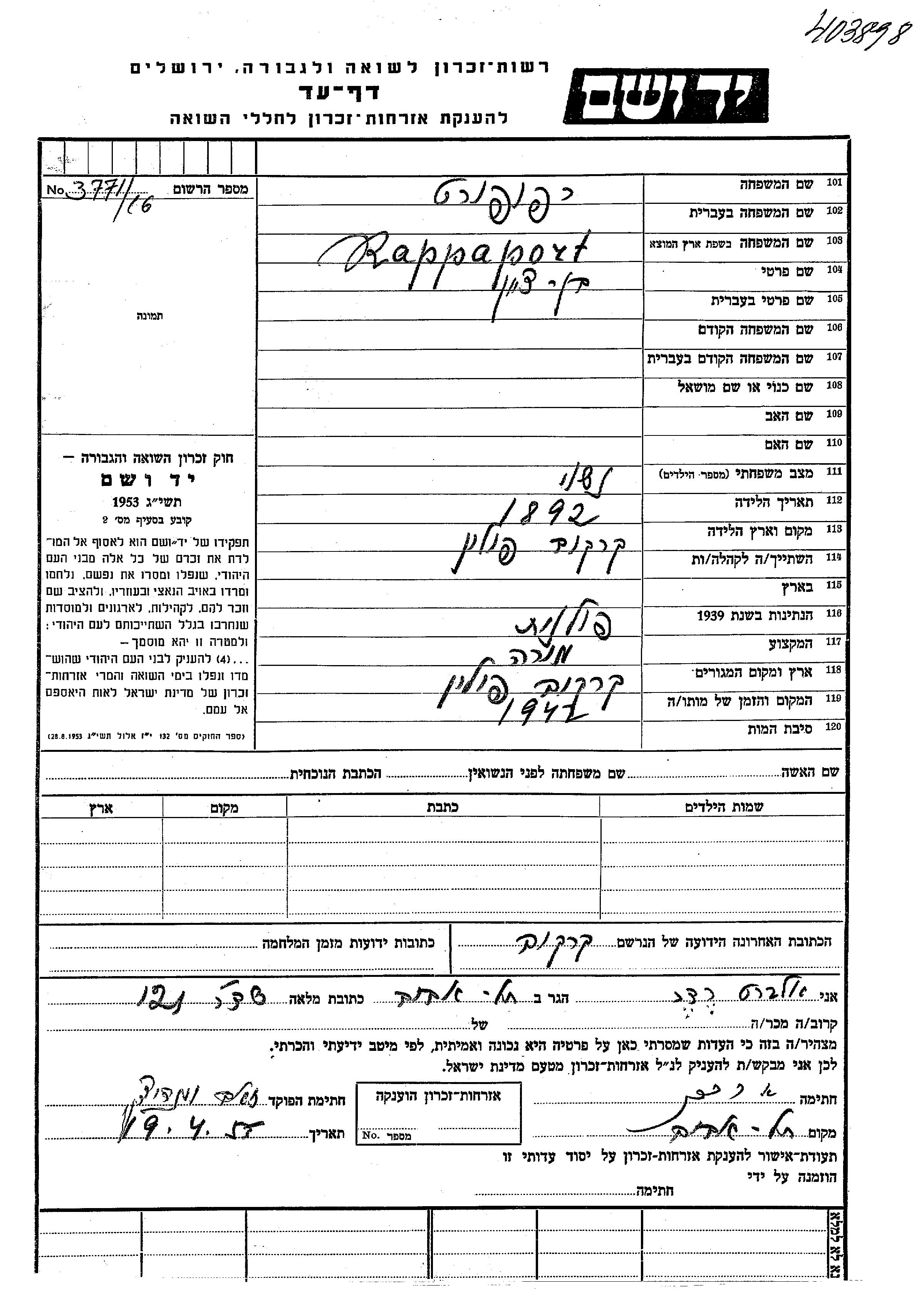 Rappaport Bentzion 1892 Krakow, Pologne Feuille de témoignage