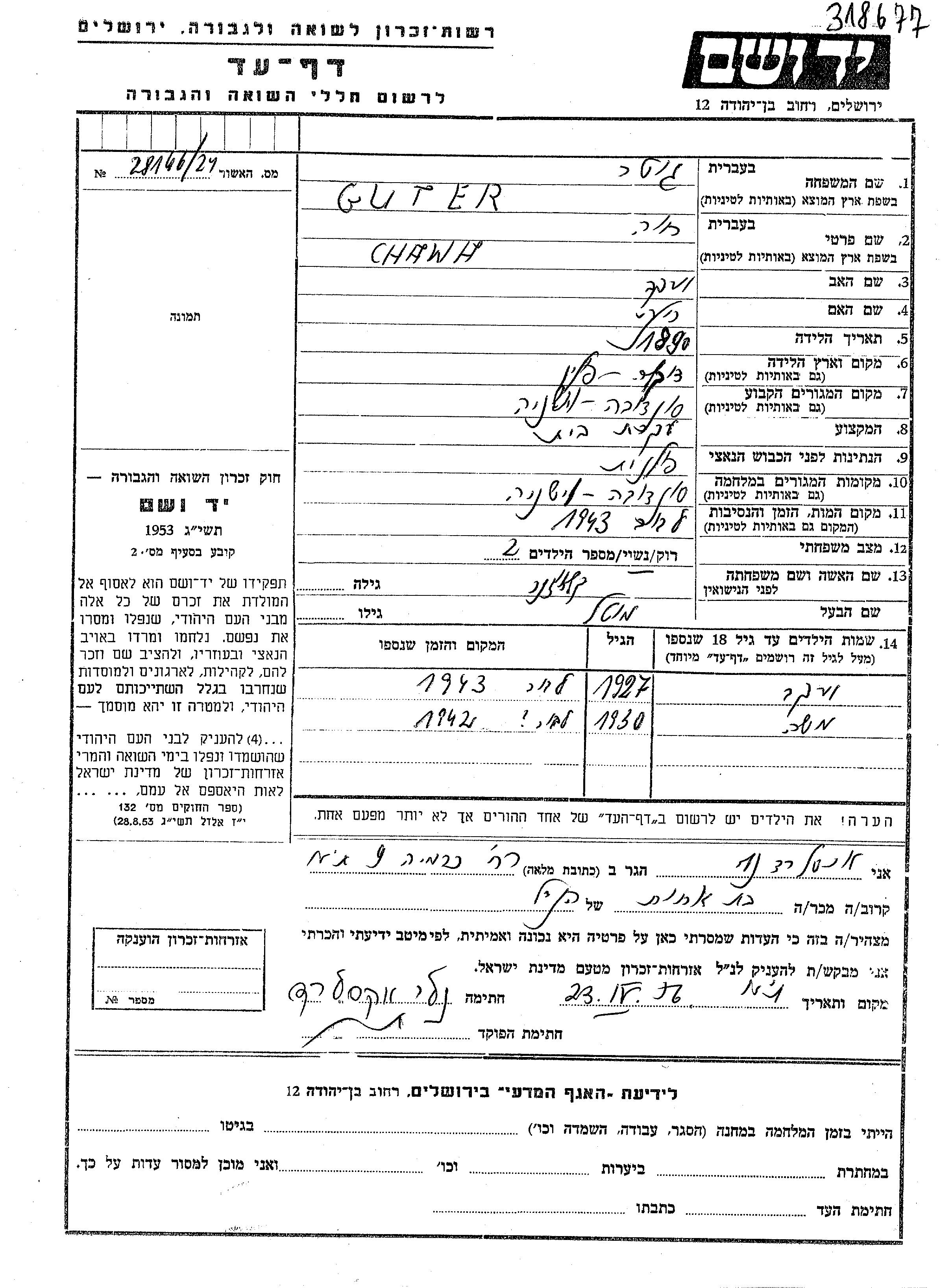 Yaakov Guter est né en 1927, fils de Motel et de Chawa née Klauzner. Il était Enfant. Avant la seconde guerre mondiale il vivait à Sadowa Wisnia, Pologne. Au cours de la guerre, il était à Sadowa Wisnia, Pologne.