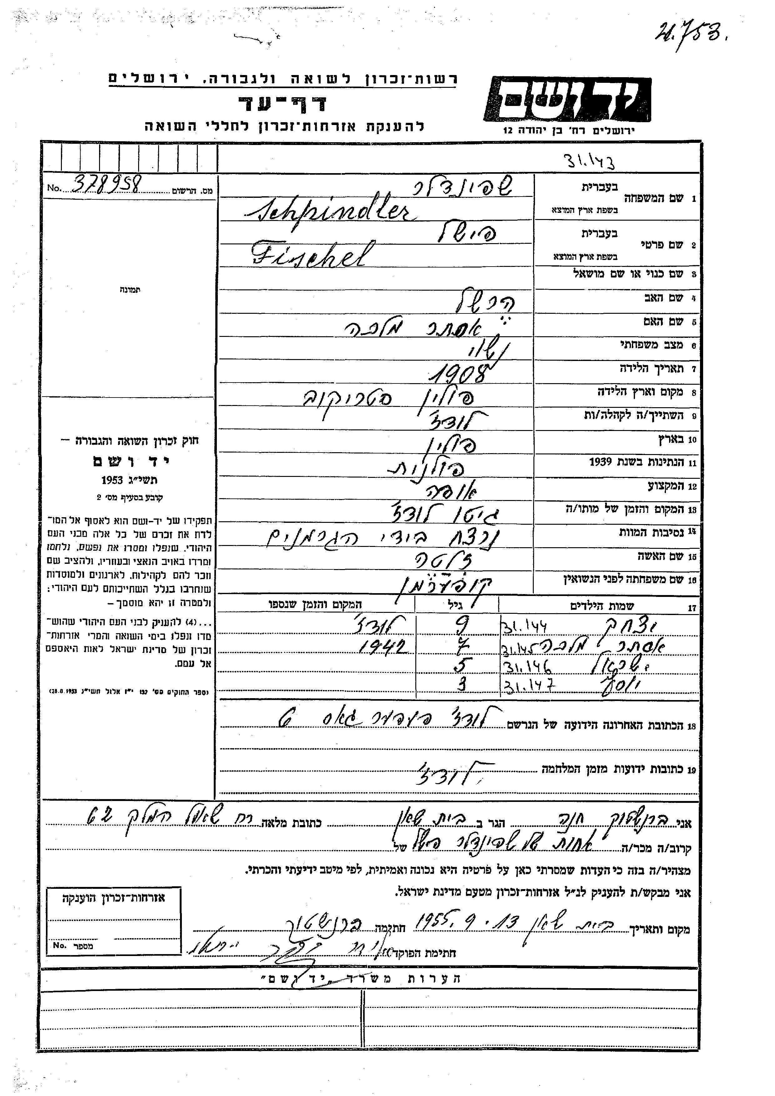 Schpindler Yisrael Lodz, Pologne Feuille de témoignage