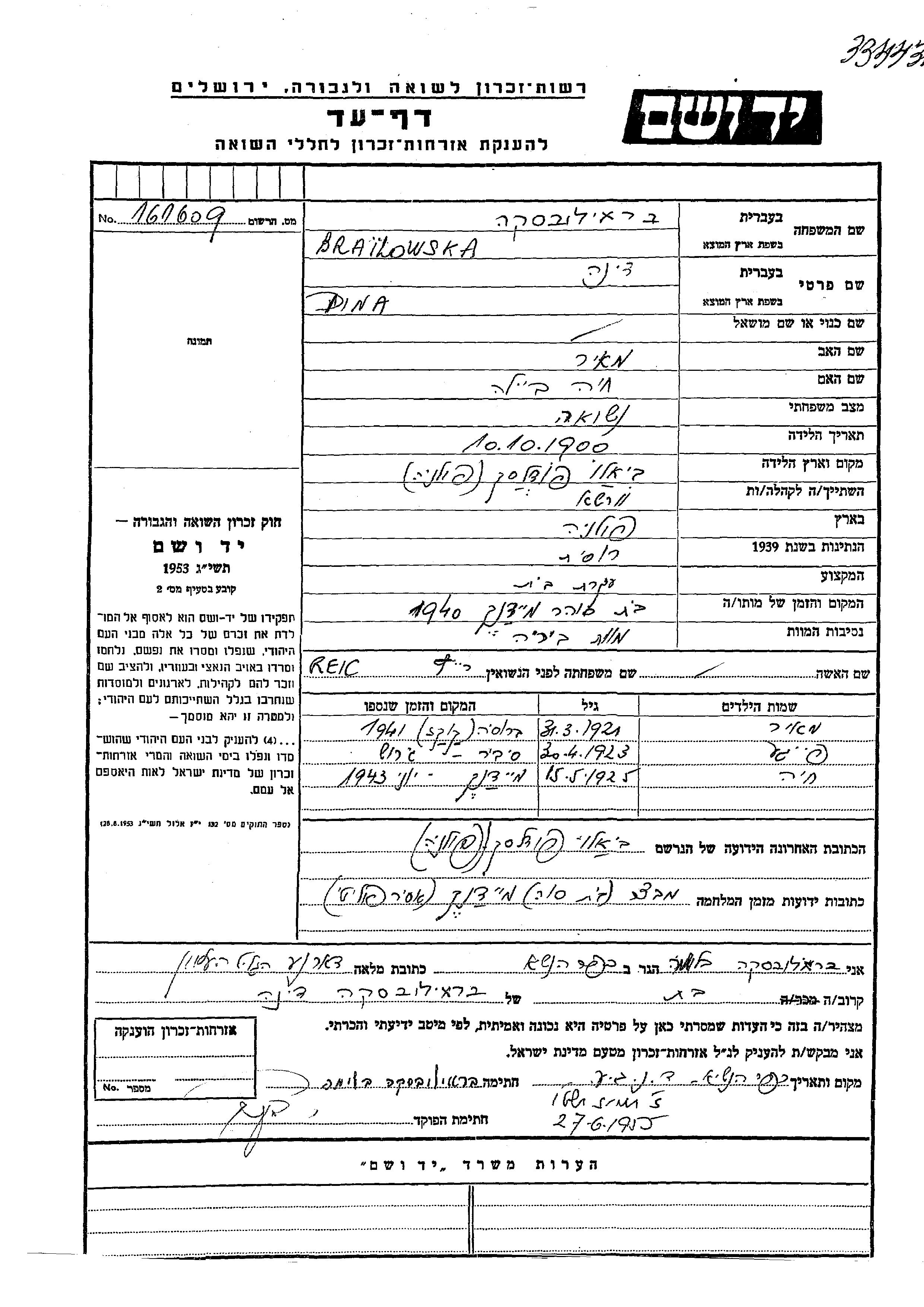 Brailowski Khaia 1925 Warszawa, Pologne Feuille de témoignage