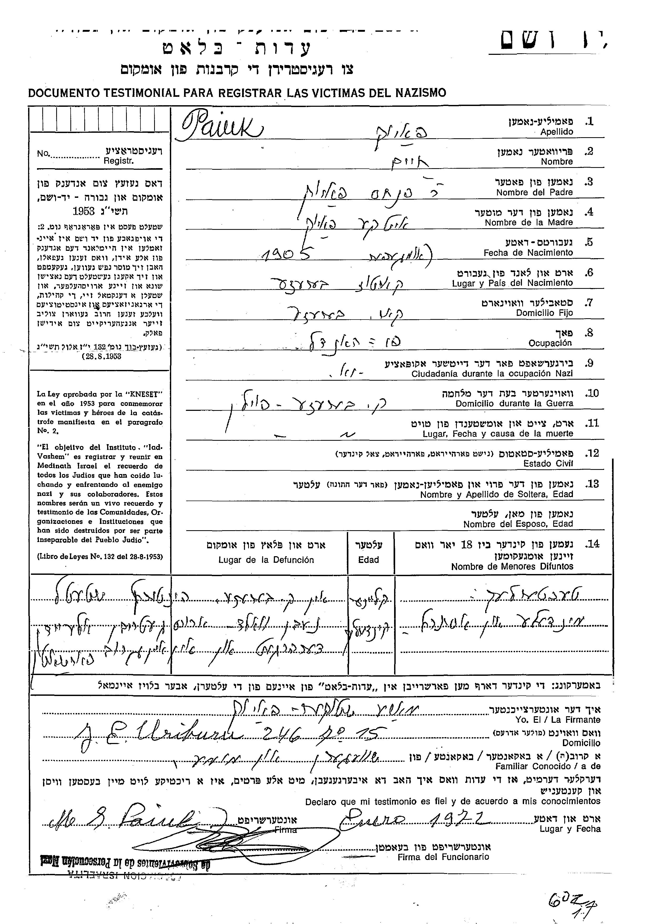 Paiuk Mindele Bereza Kartuska, Pologne Feuille de témoignage