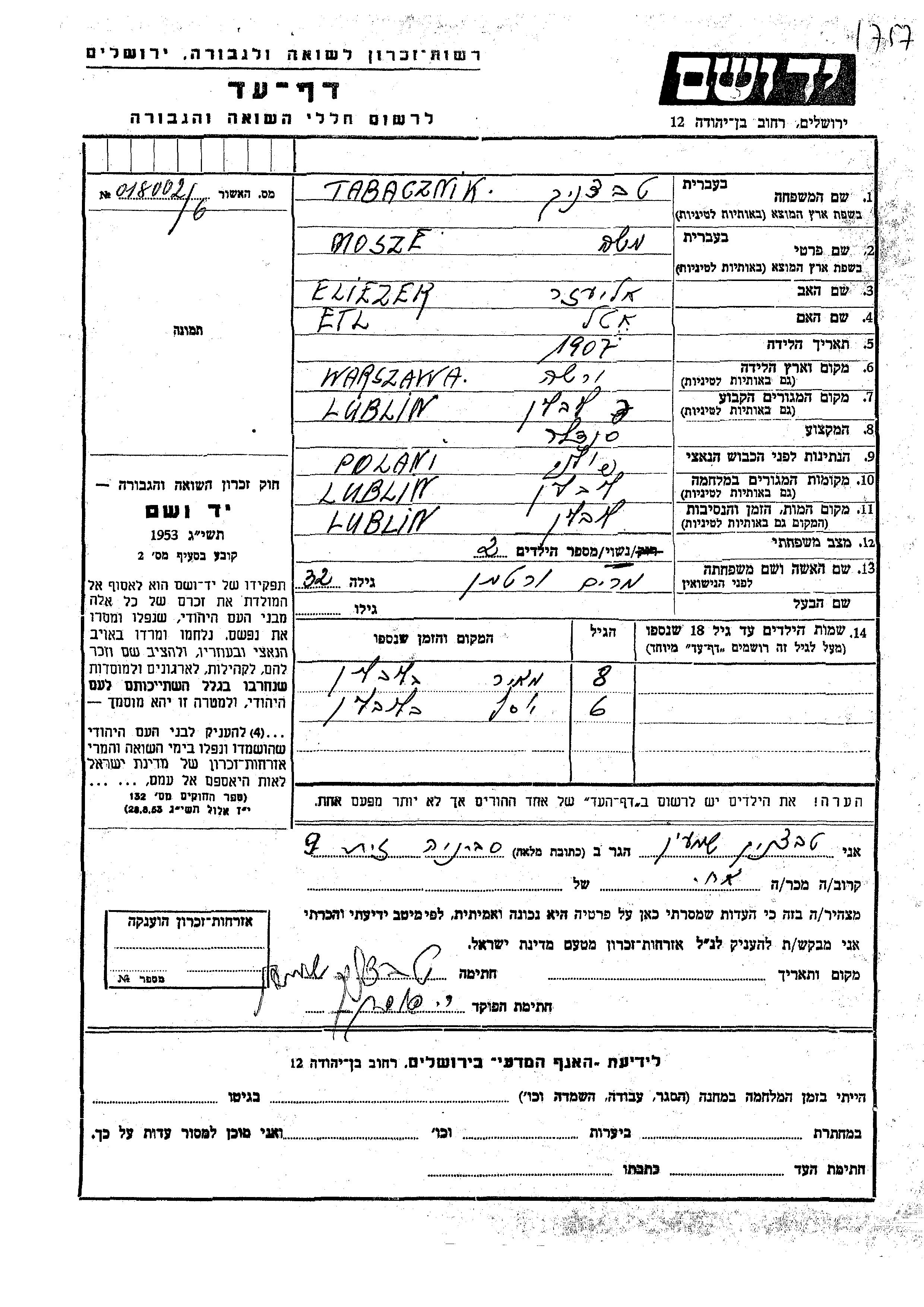 Yosef Tabacznik est né fils de Mosze et de Miriam née Vartman. Il était Enfant. Avant la seconde guerre mondiale il vivait à Lublin, Pologne. Au cours de la guerre, il était à Lublin, Pologne.