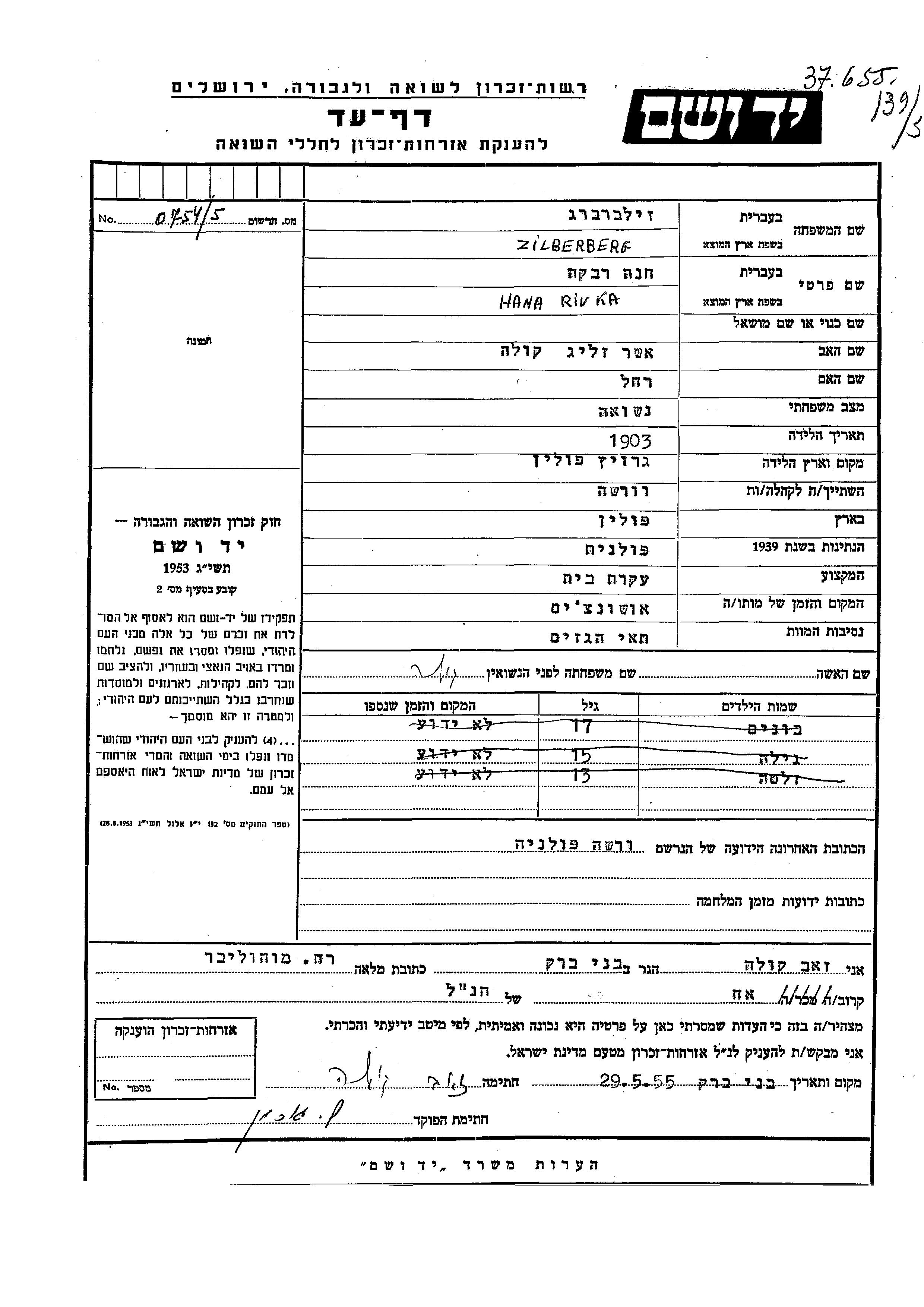 Zilberberg Zlata Warszawa, Pologne Feuille de témoignage